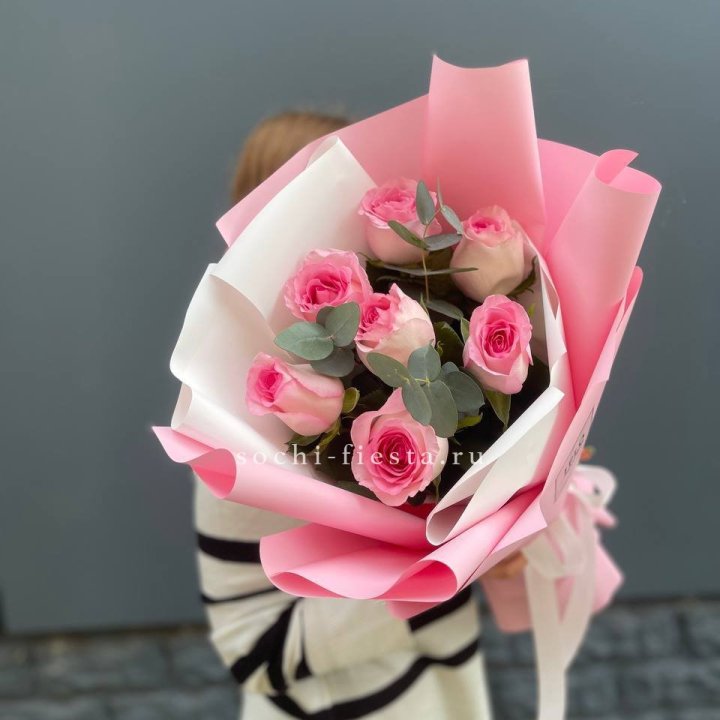 7 розовых роз с эвкалиптом