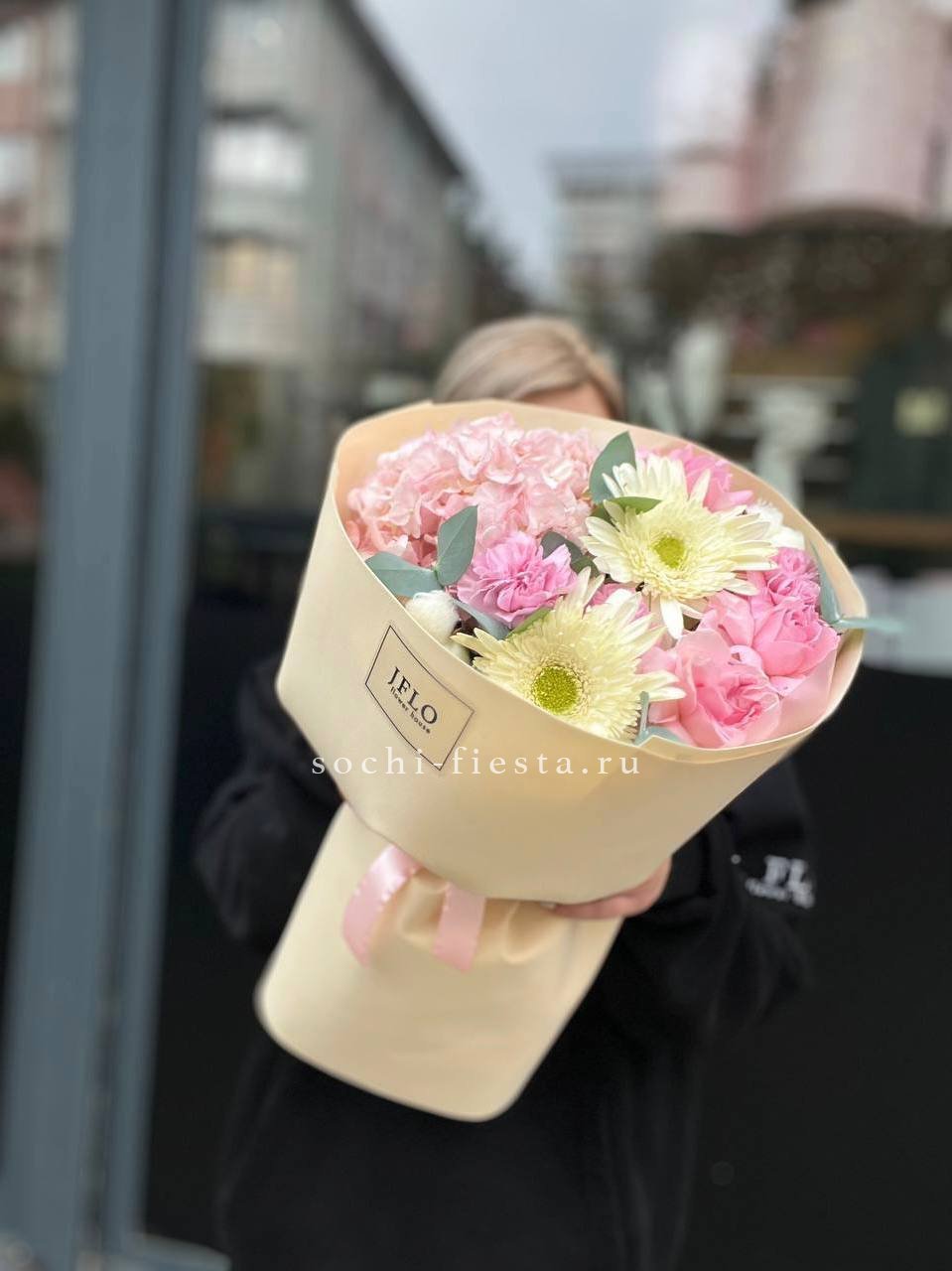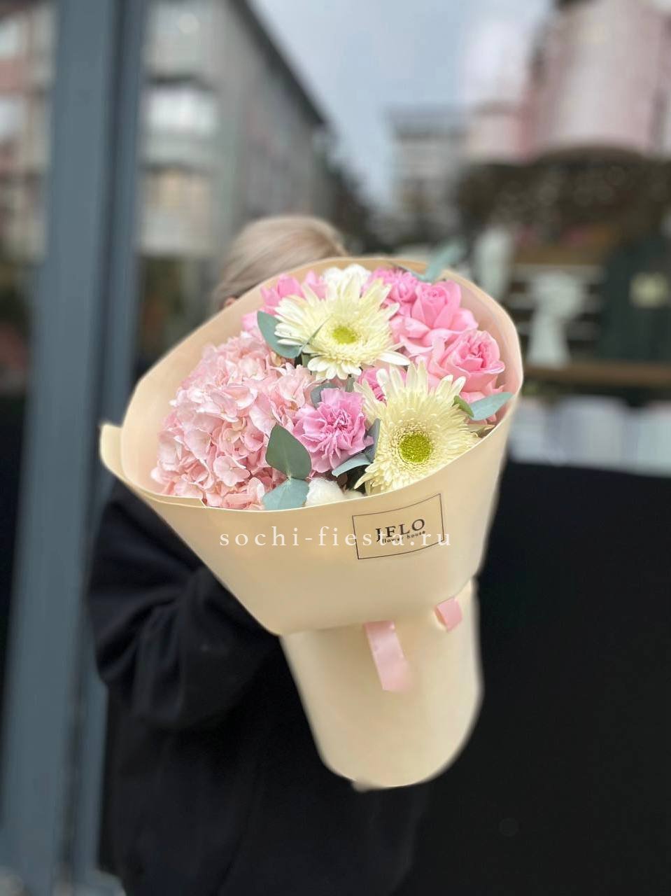 Авторский букет в составе которого: пионы, гортензии, эустома,альстромерии, маттиола,озатамус, лента и дизайнерская пленка.