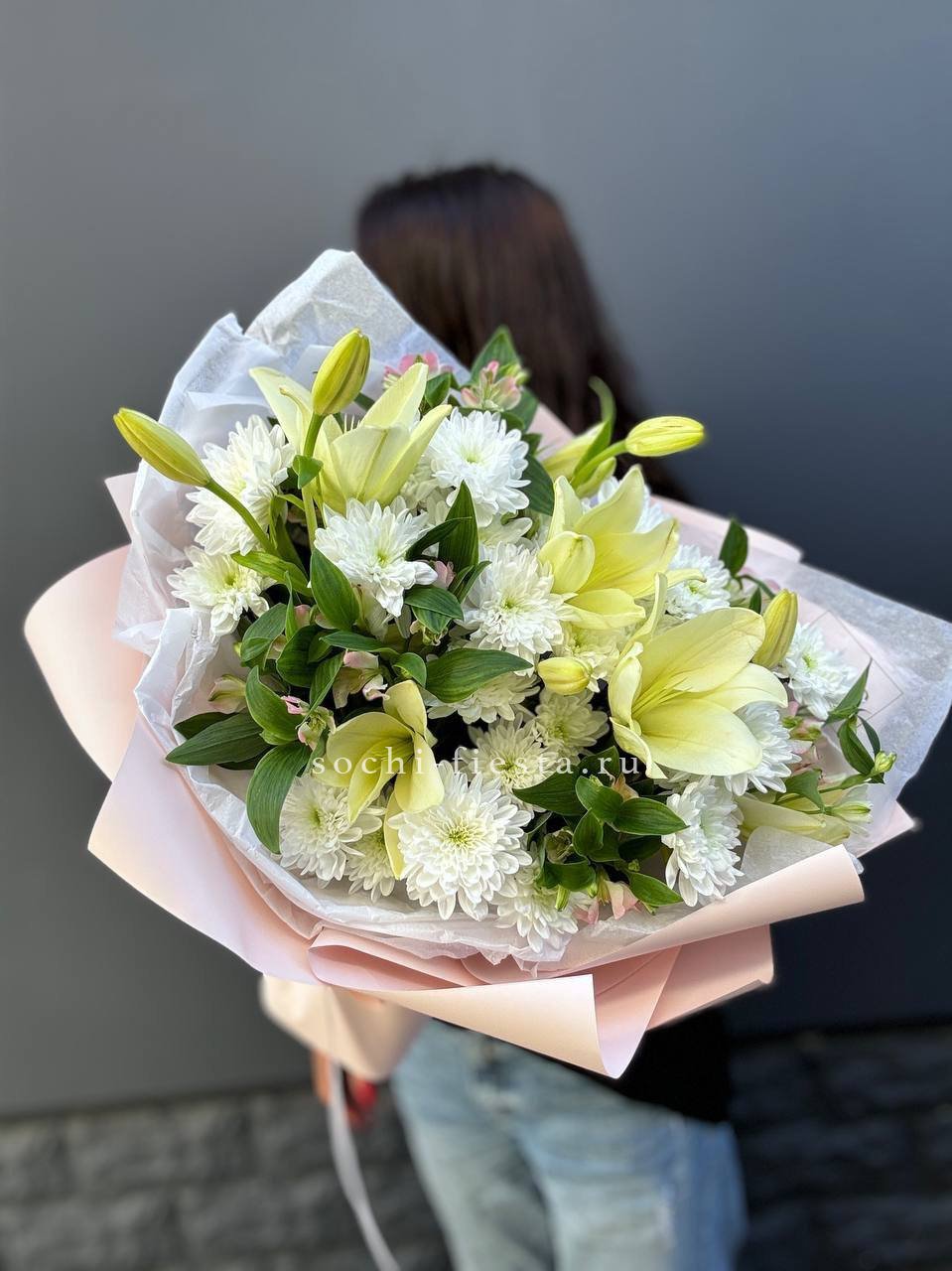 Состав: хризантема, лилия, альстромерия (возможна замена от сезона), упаковка