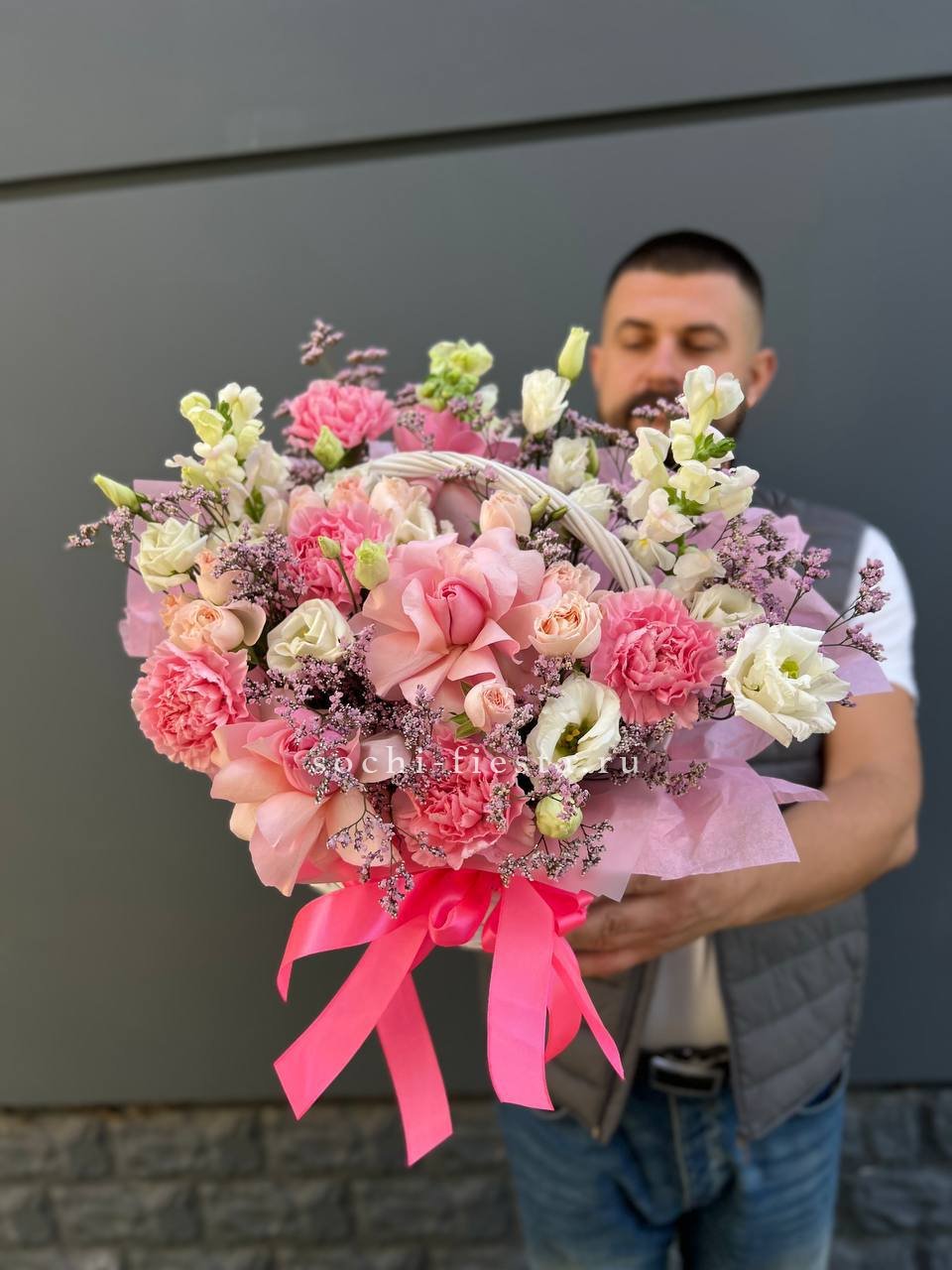 Состав : хризантемы, розы, диантусы, маттиола в оформлении с элементами бус (возможна замена)