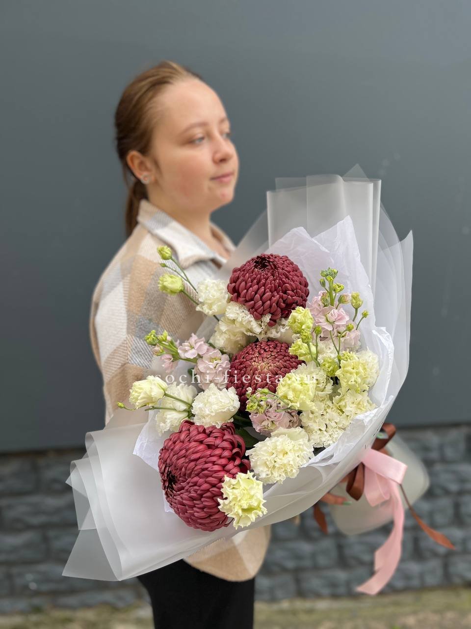 Состав: воздушный букет из стойкой маттиолы, эустомы и хризантемы Бигуди в оформлении