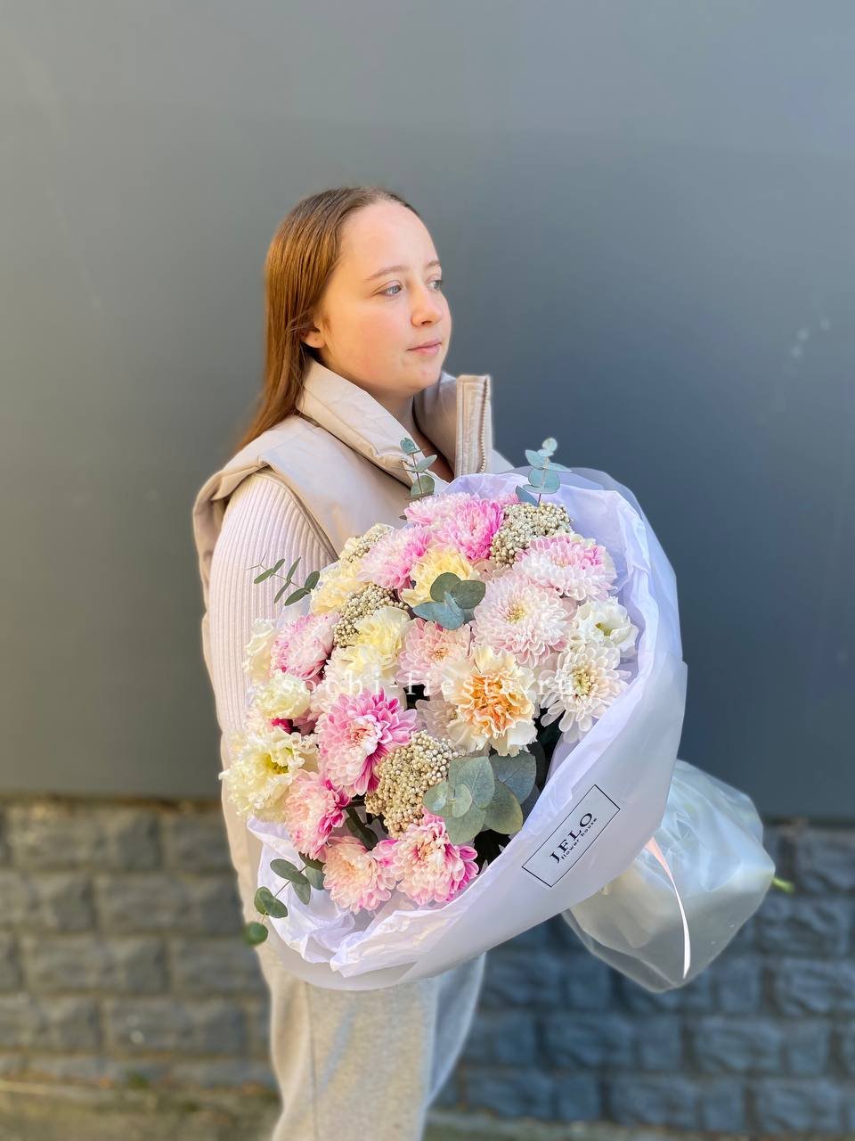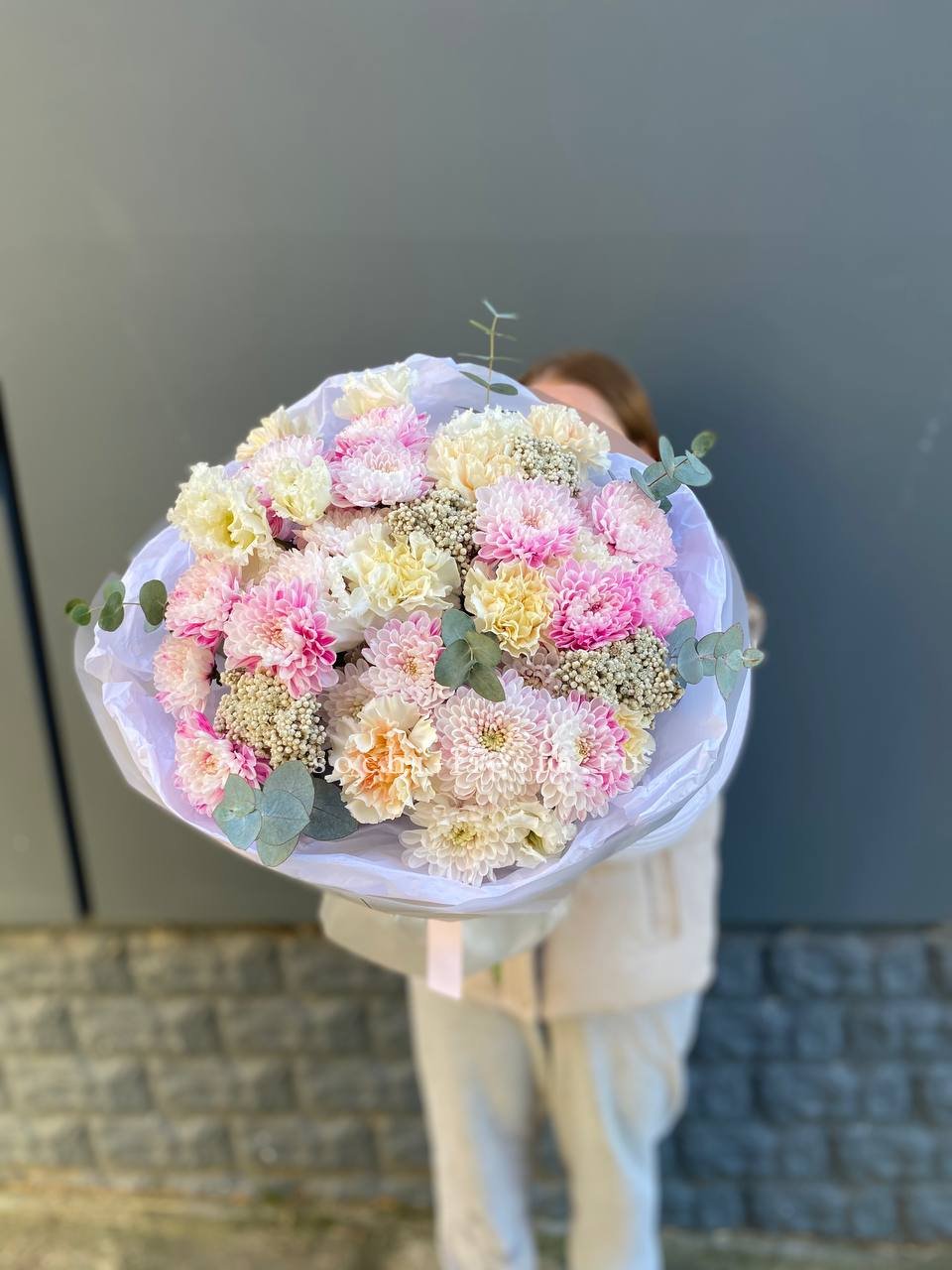 Состав: хризантема кустовая , эустома , озотамус, диантус в воздушном оформлении с эвкалиптом