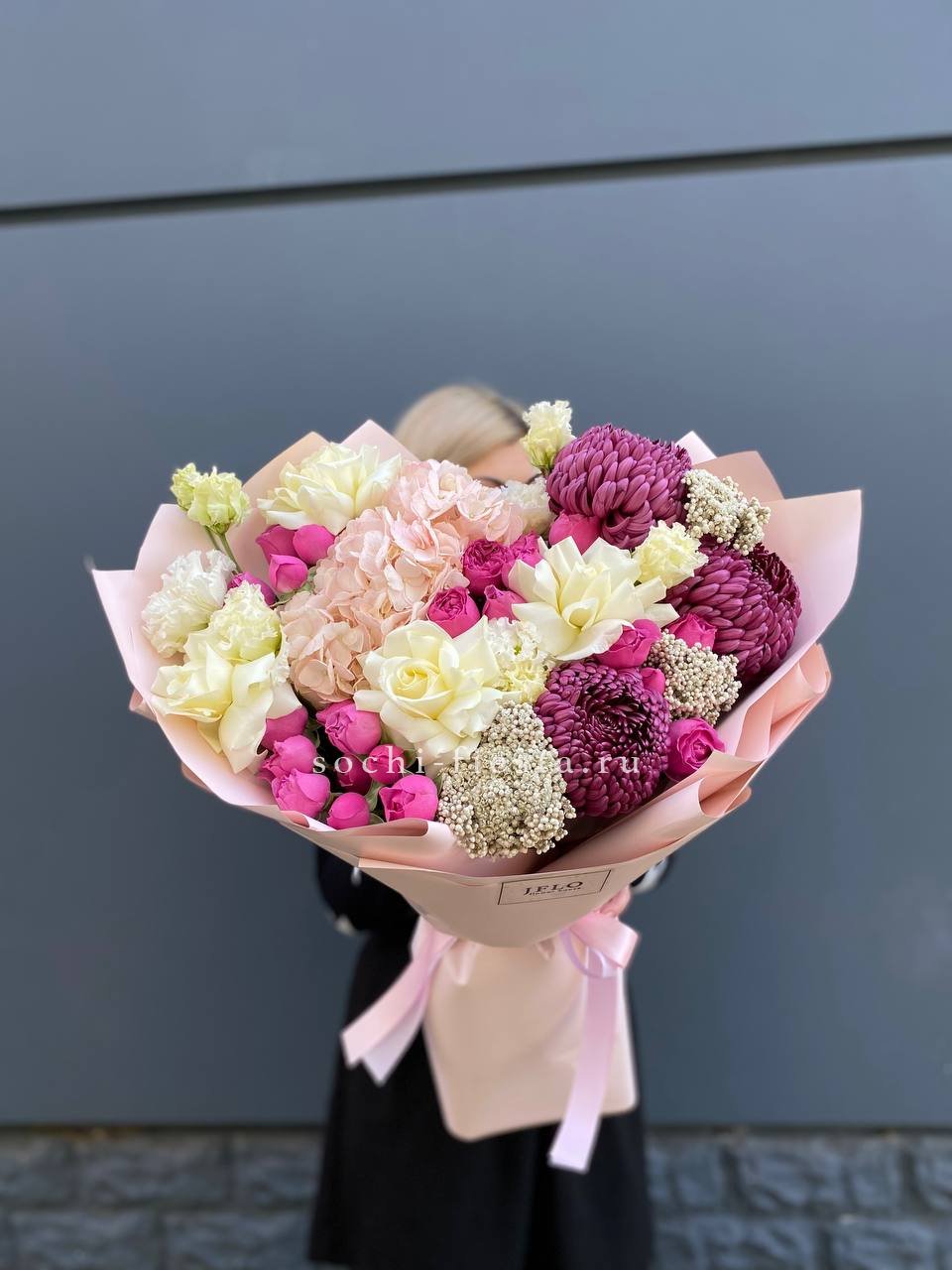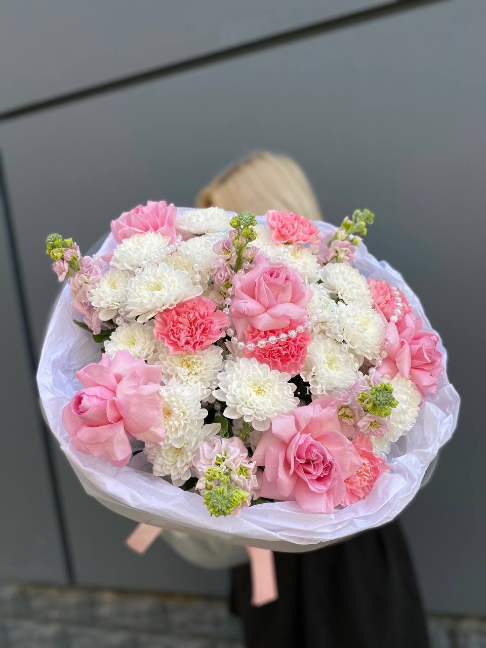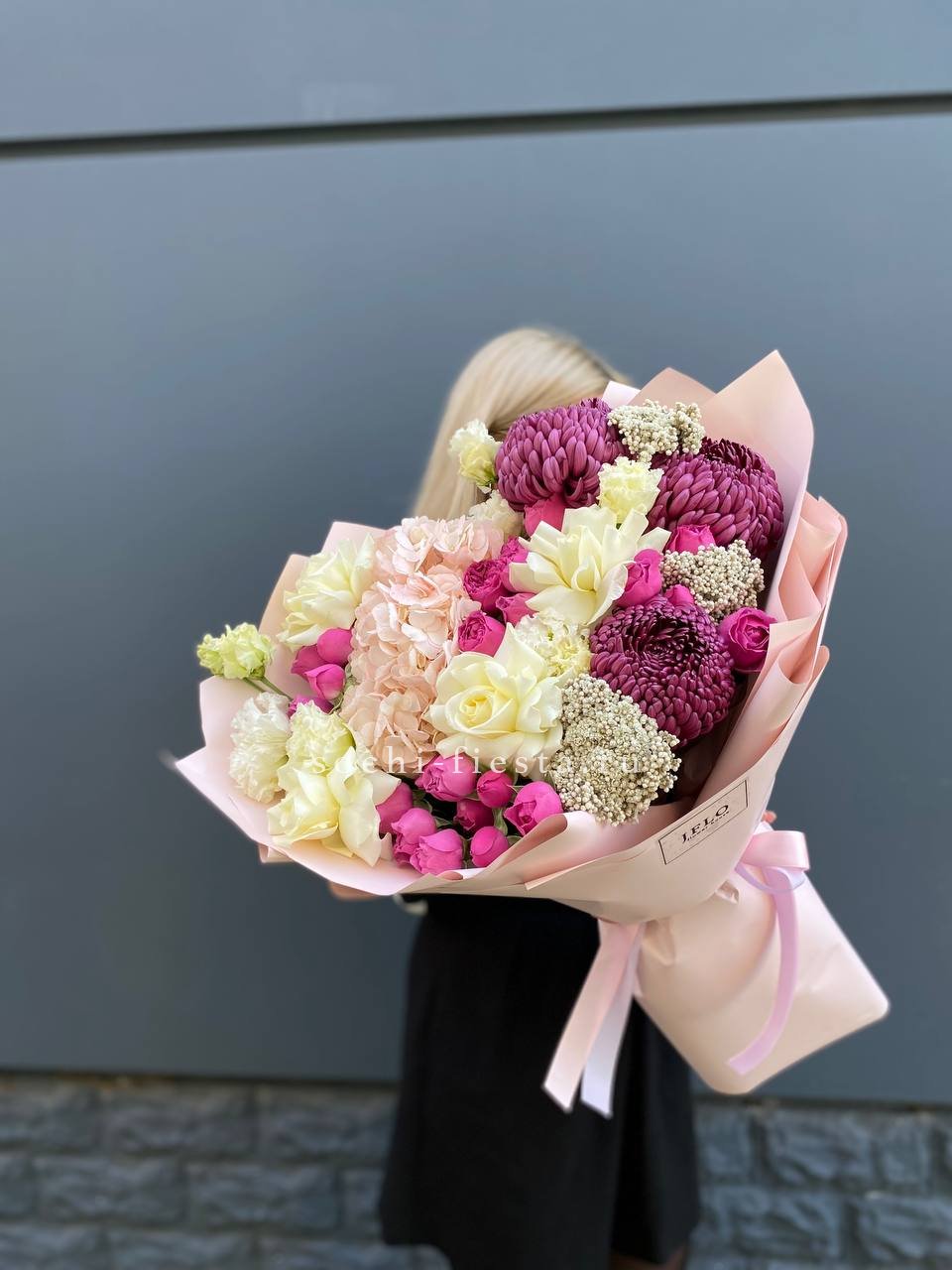 Состав: бигуди, мисти баблс, эустома, белая роза, озатамус, гортензия в нежном оформлении