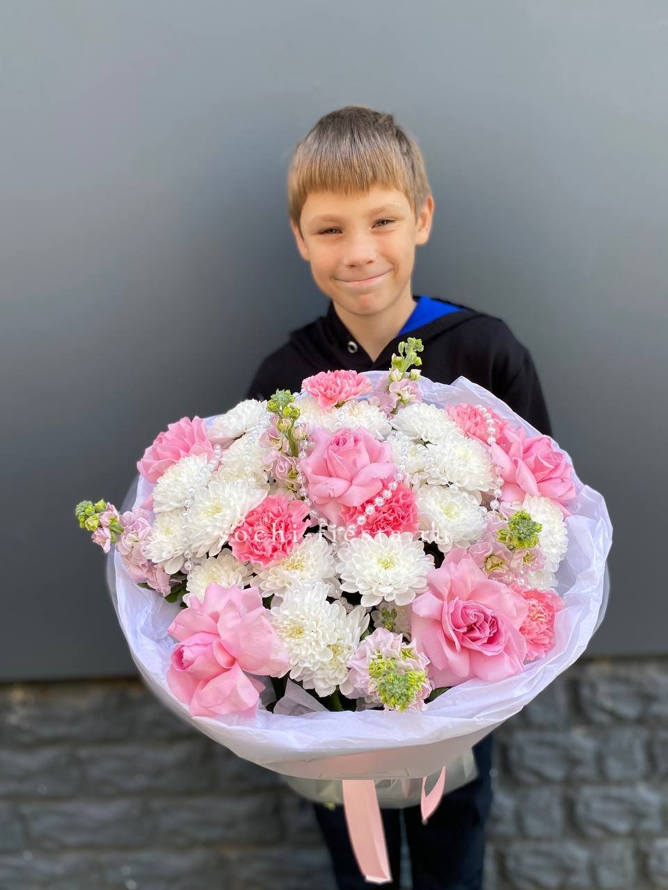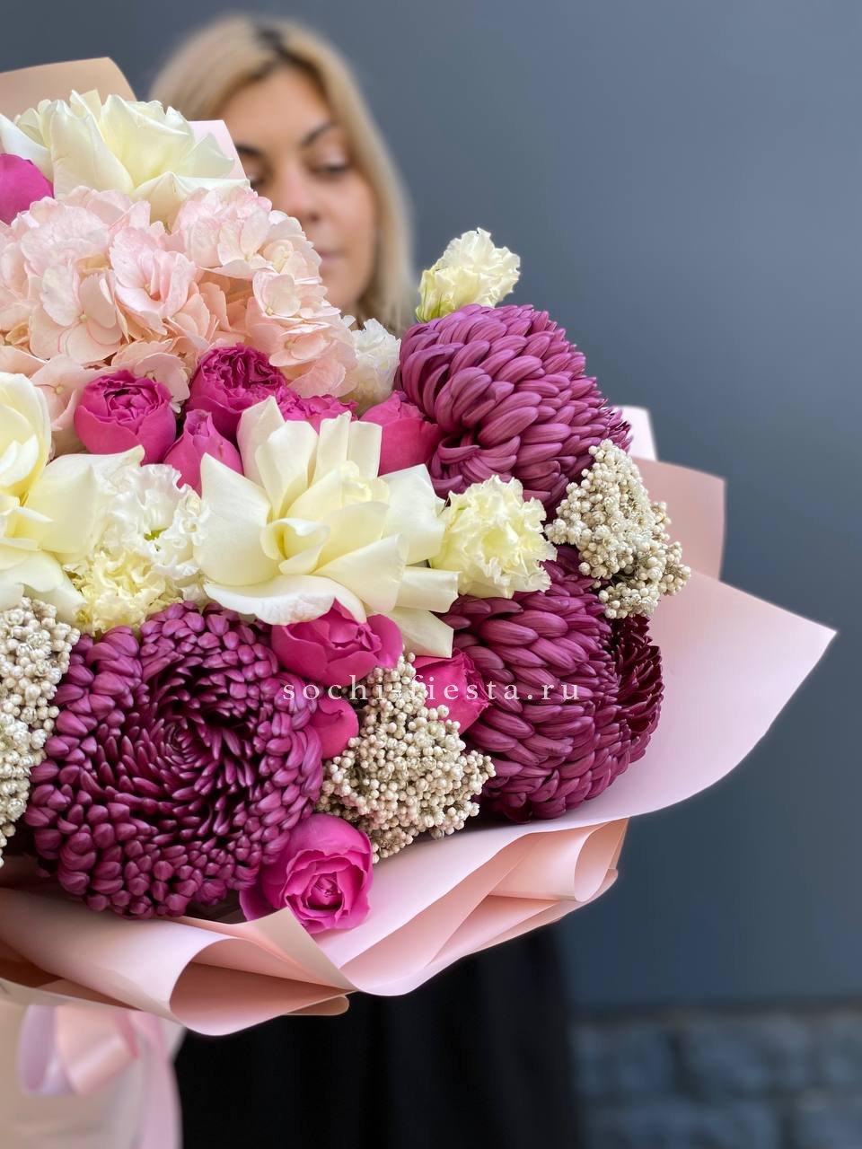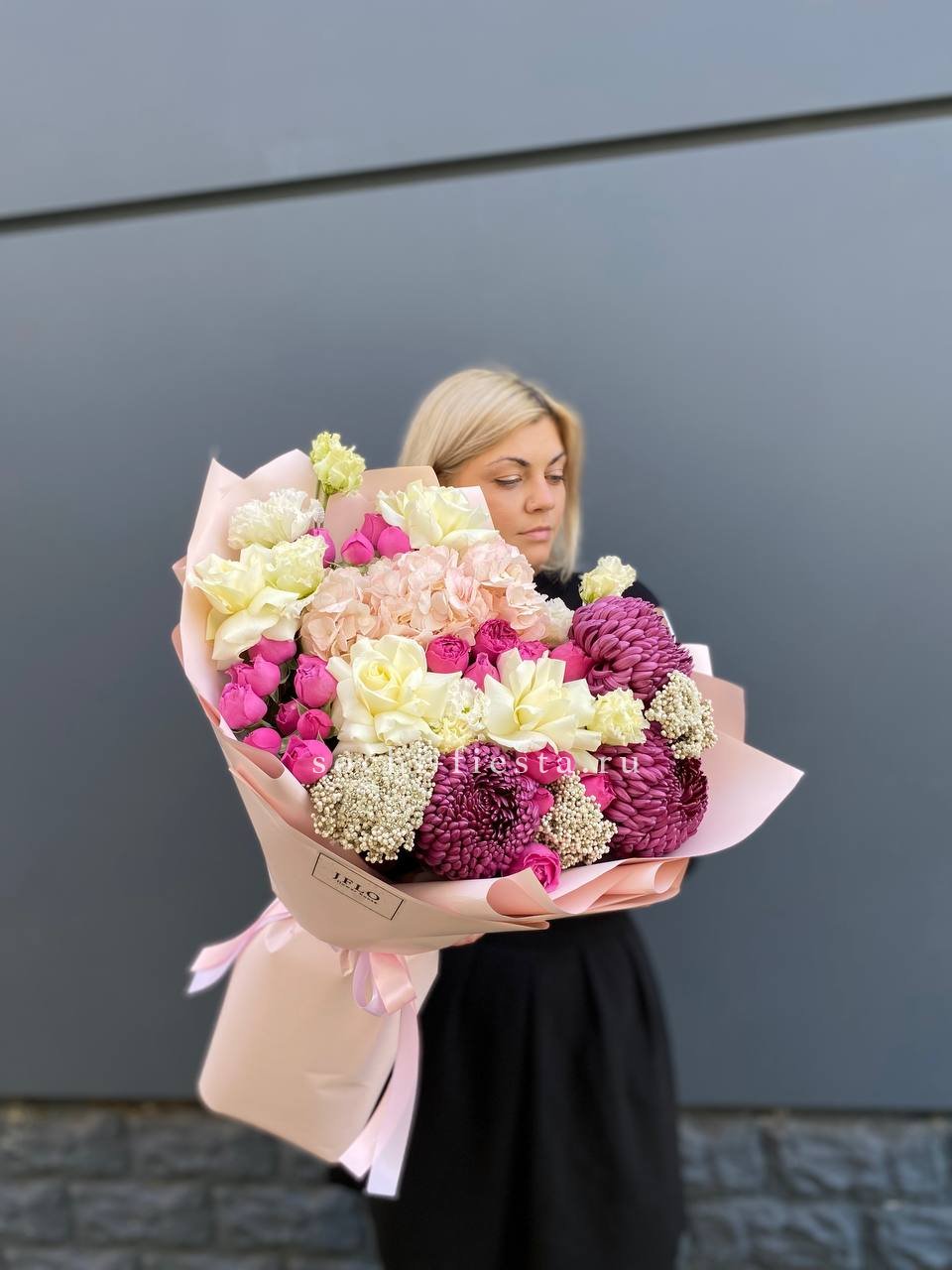 Состав: бигуди, мисти баблс, эустома, белая роза, озатамус, гортензия в нежном оформлении