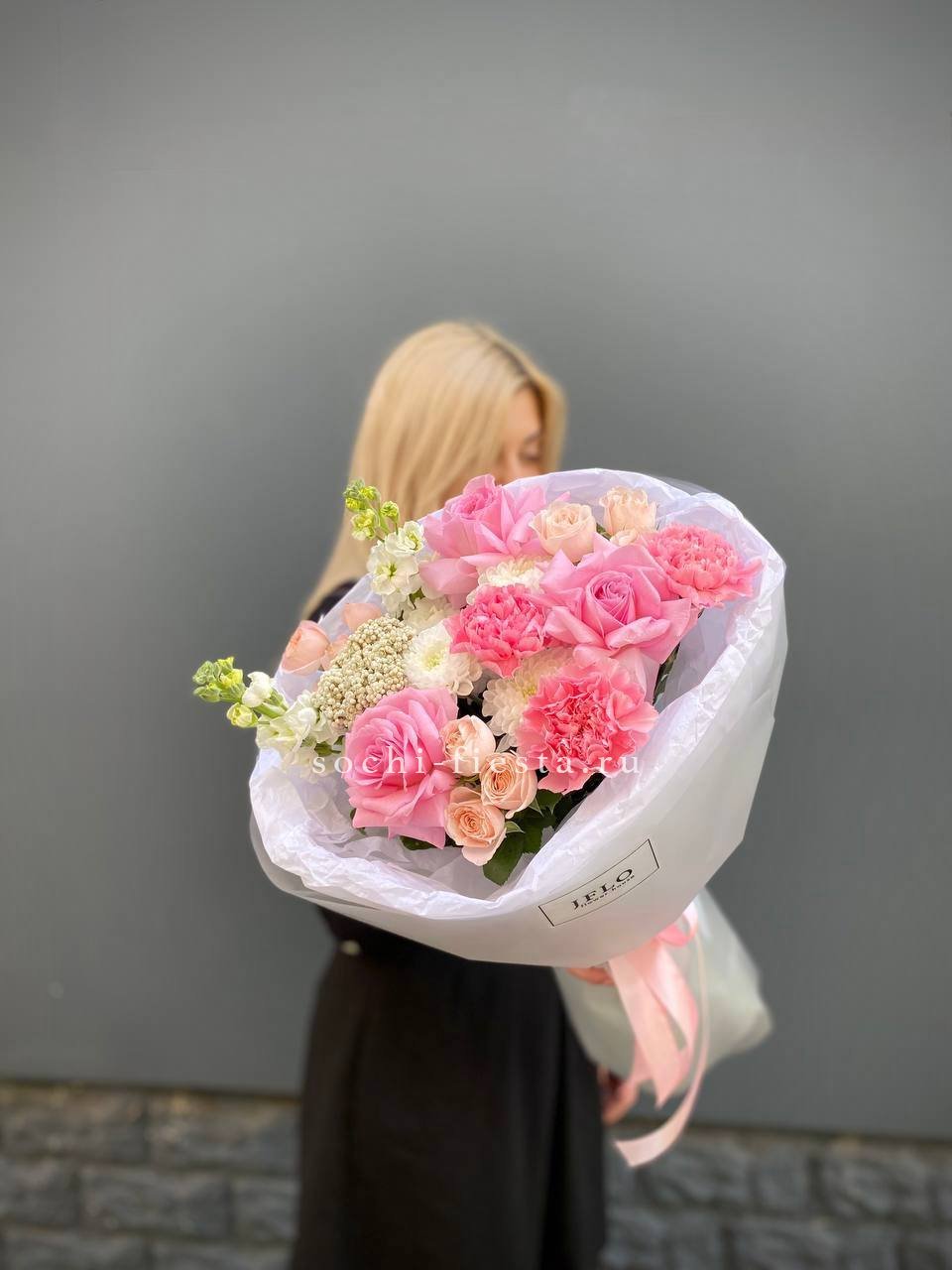 Состав: букет из нежных стойких цветов диантусов, роз, хризантем, маттиолы, озатамуса, бомбастика