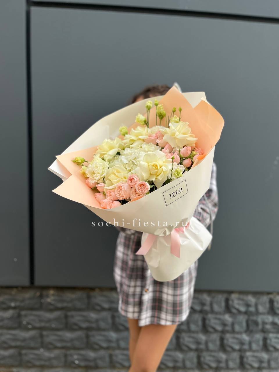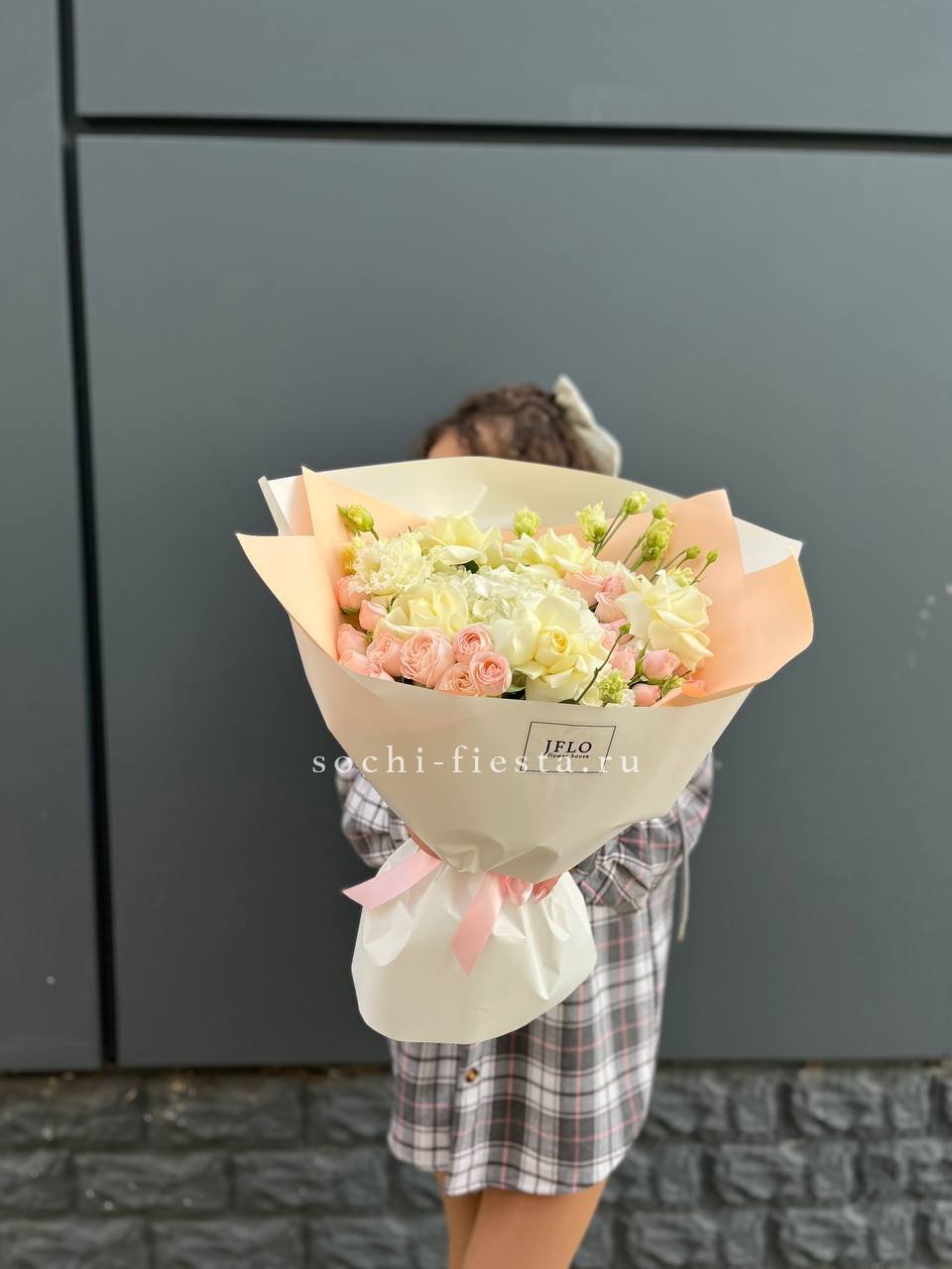 Состав: гортензия, белая роза, эустома, бомбастик в оформлении