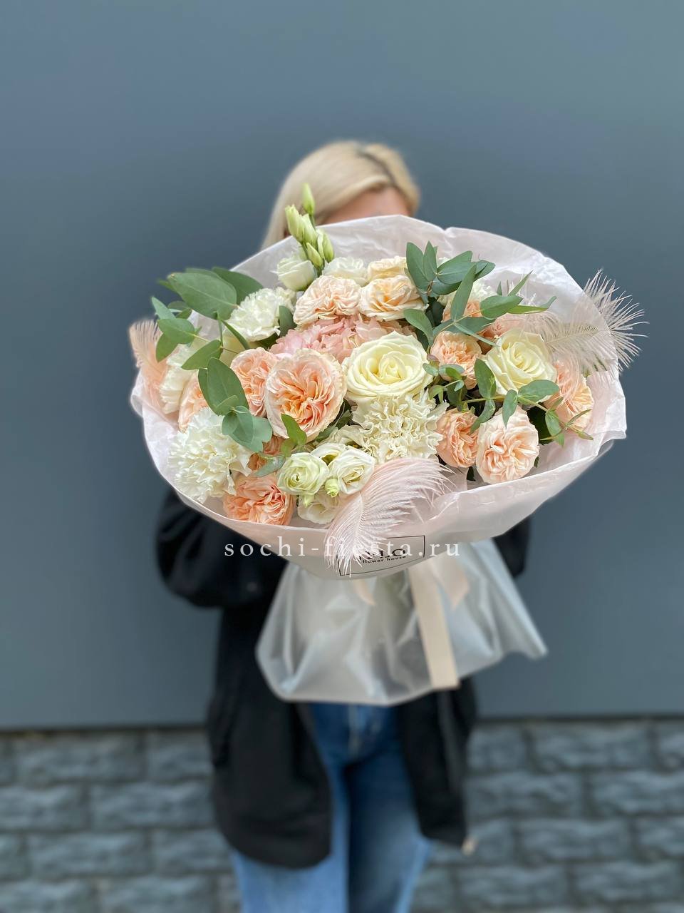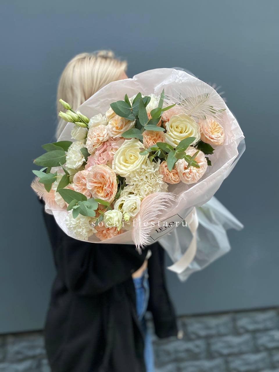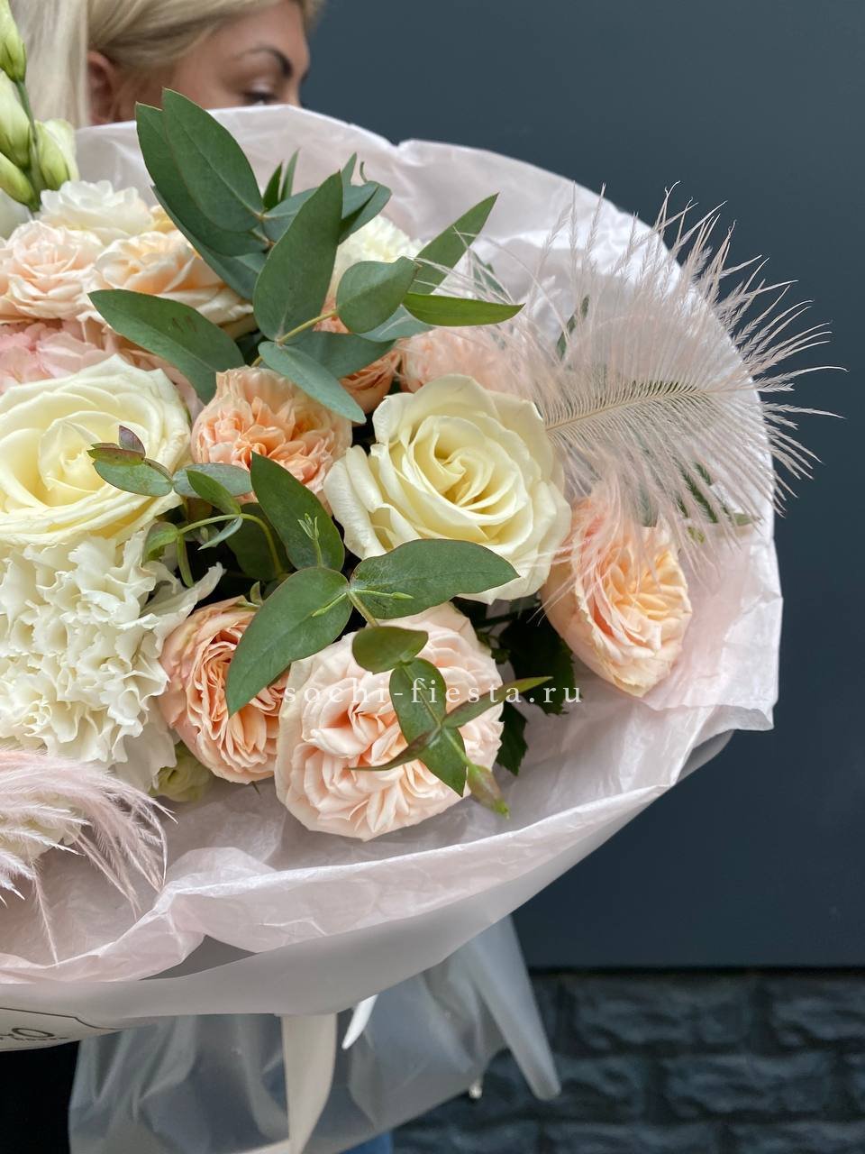Состав: эвкалипт, гортензия, перо, кустовая роза, эустома, роза белая, диантус, упаковка