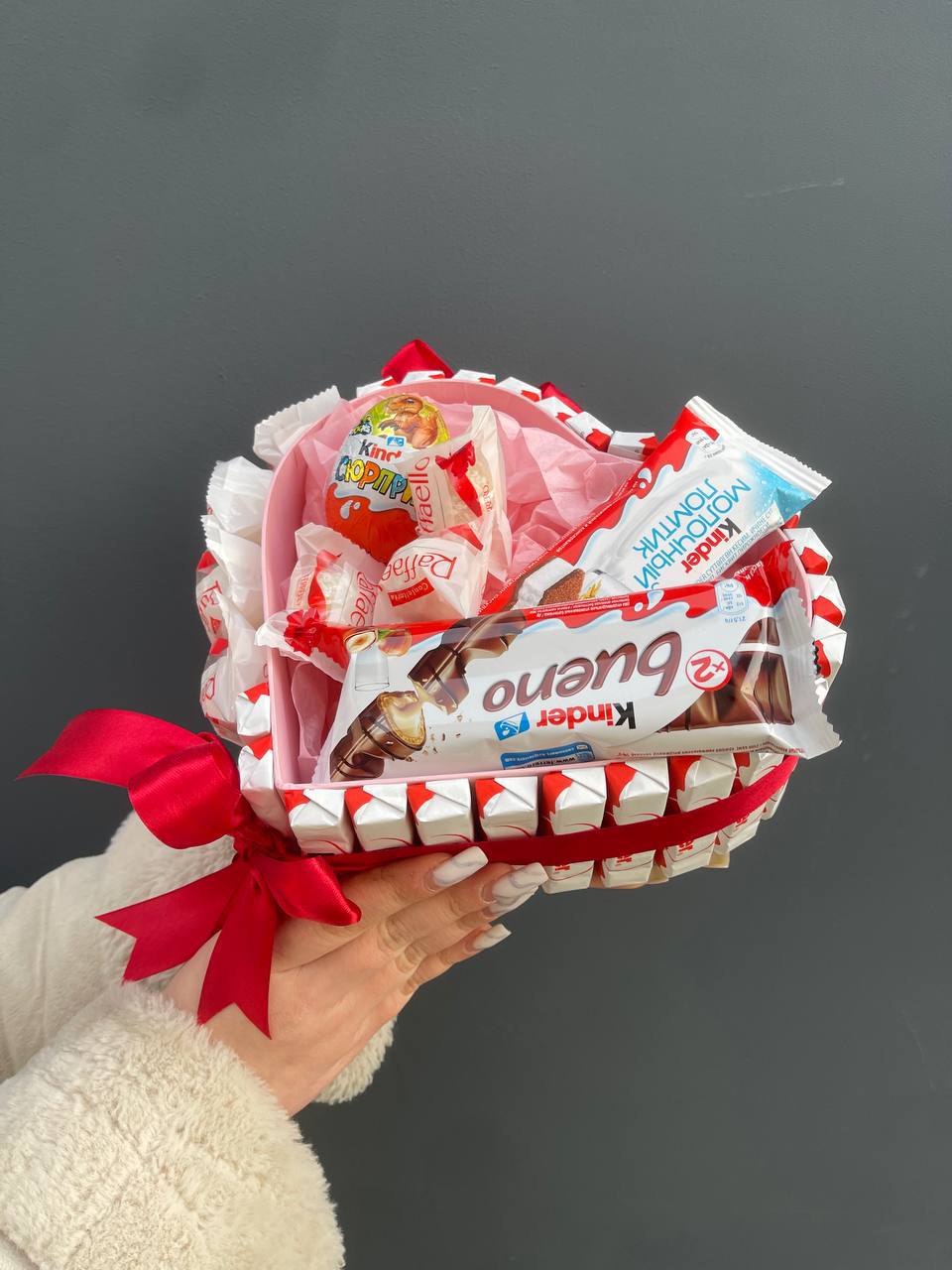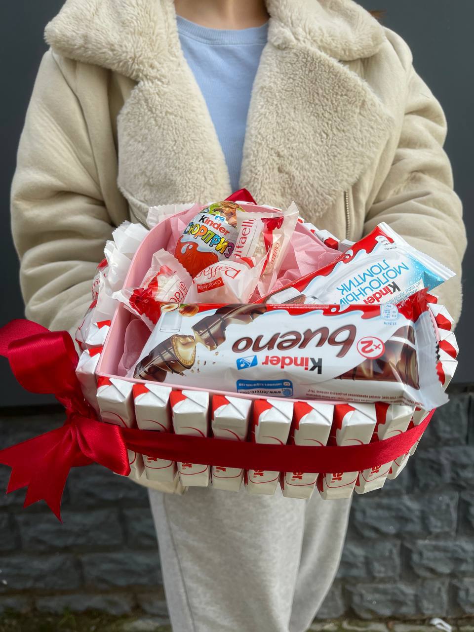 Яйца Kinder- 1шт., Kinder шоколад- 4 уп., Kinder Bueno- 1 шт., молочный ломтик-1, Raffaello-3, наполнитель, цилиндрическая коробка.