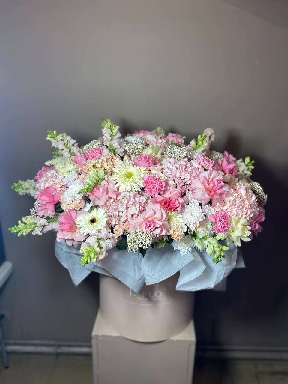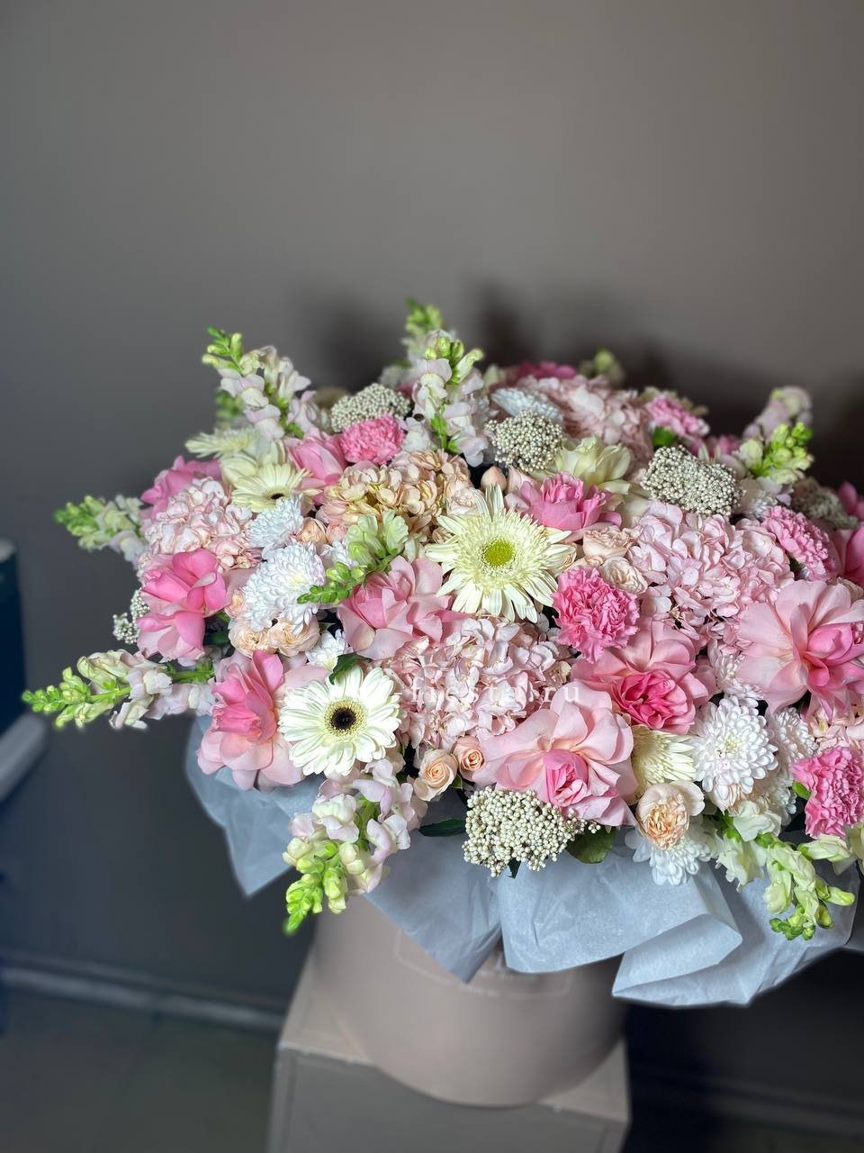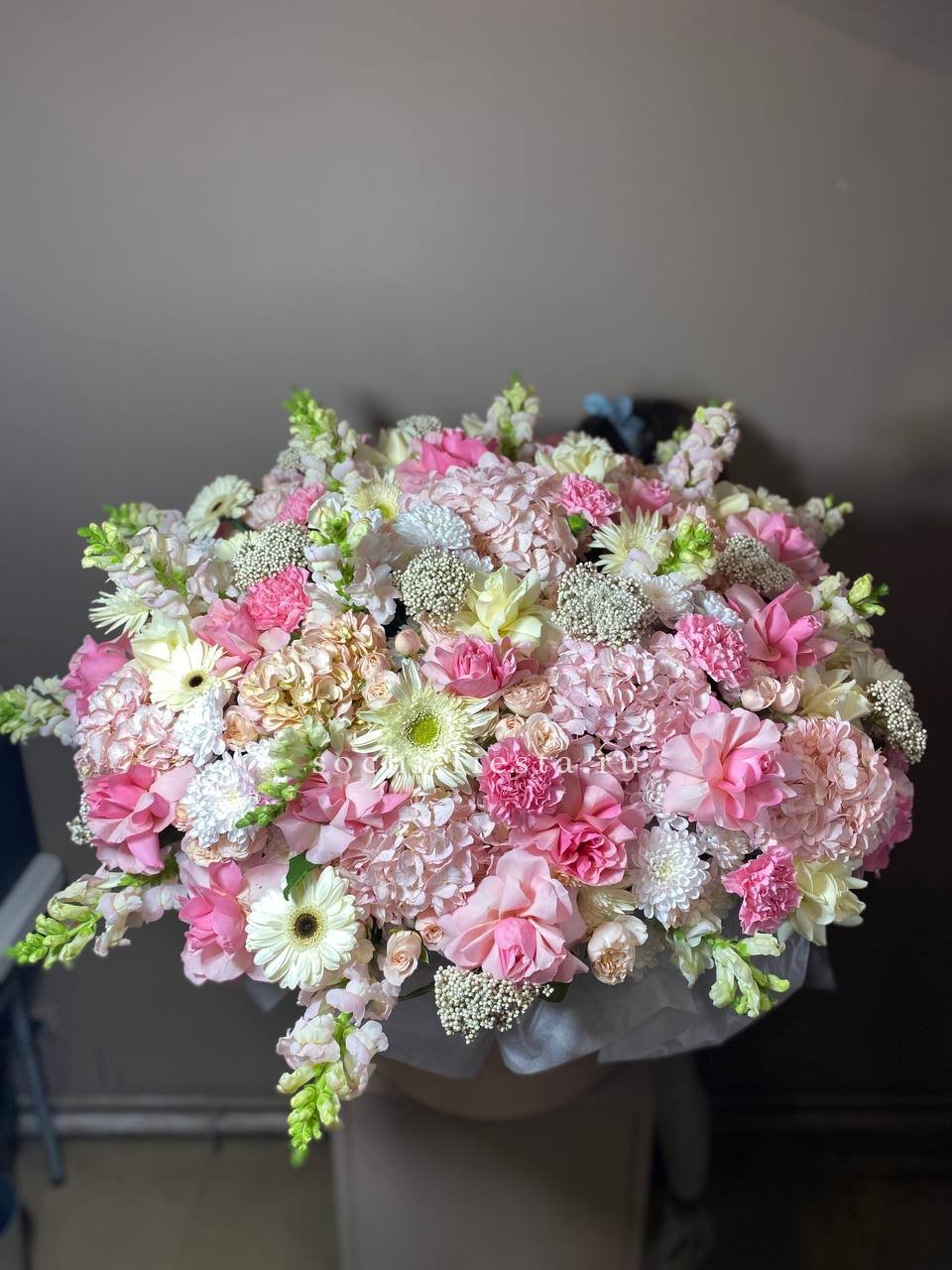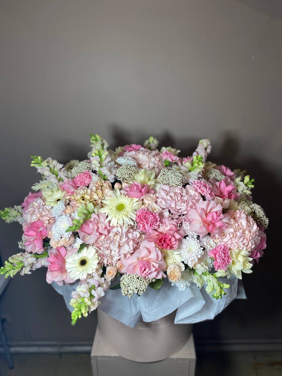 Состав: хризантемы, герберы, розы, антиринум, диантус, гортензия, бомбастик, озатамус в коробке или корзине на выбор