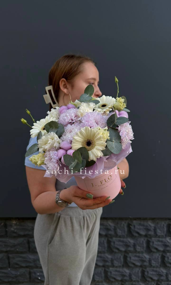 Состав: сборный нежный бокс из хризантемы, хлопка, герберы и эустомы