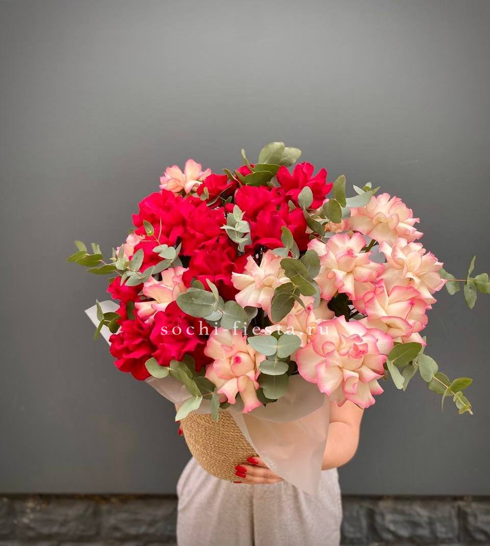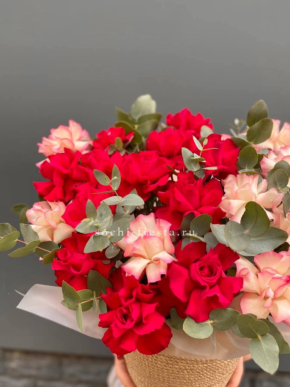 Состав: вывернутые французские розы - 25 шт., джутовое кашпо.