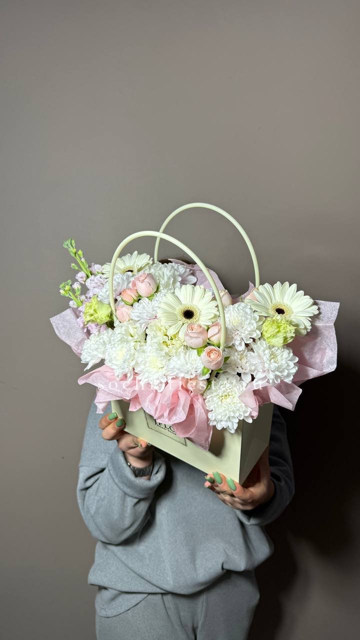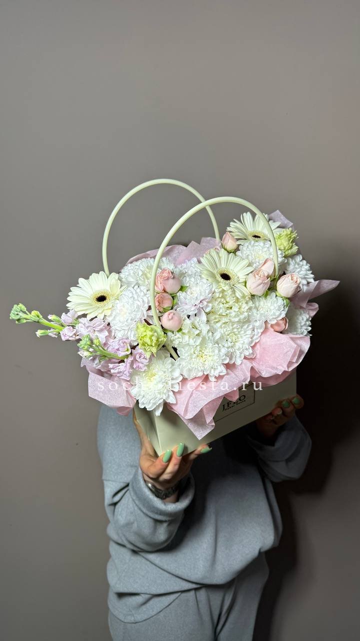 Состав: хризантема, маттиола, гербера, бомбастик, эустома, сумочка