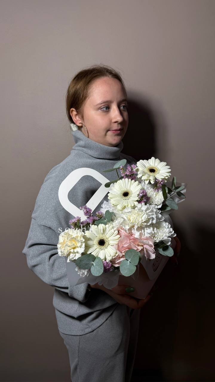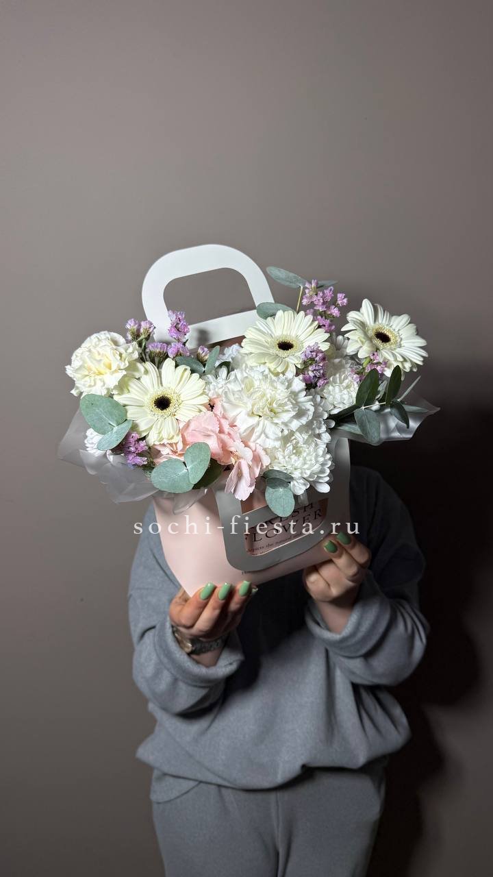 Состав: гербера, хризантема, диантус, статица, гортензия, сумочка