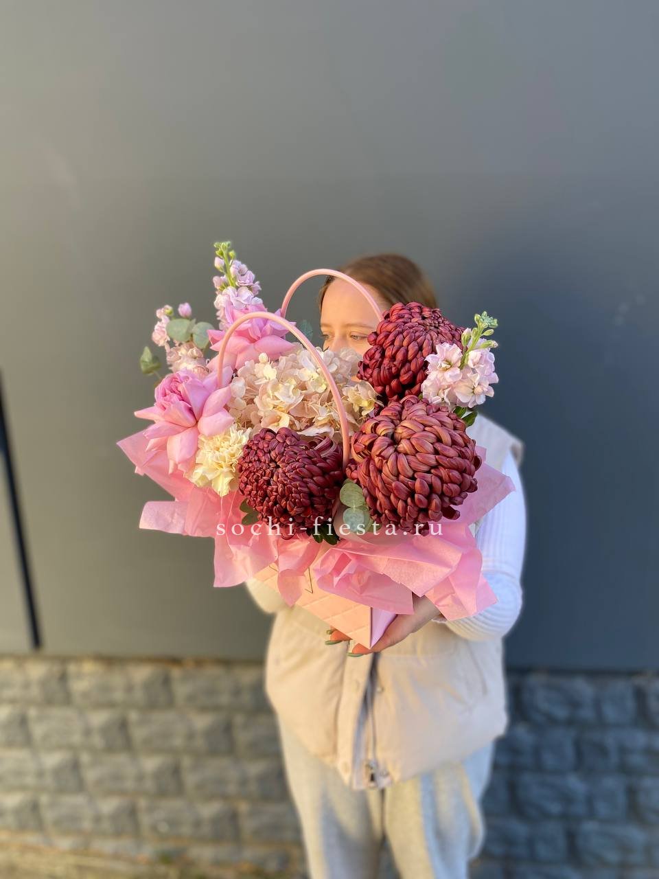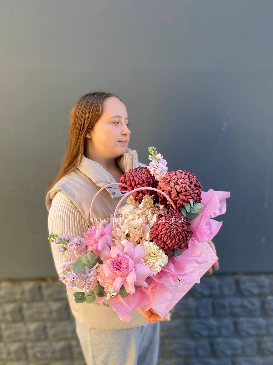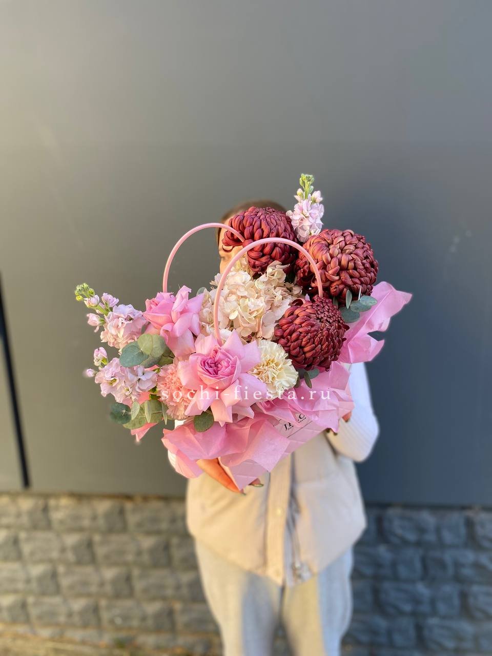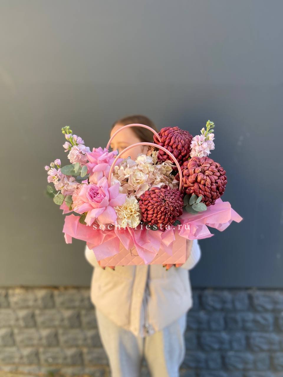 Состав: бигуди, розовые розы, гортензия, маттиола, эвкалипт, диантусы, сумочка