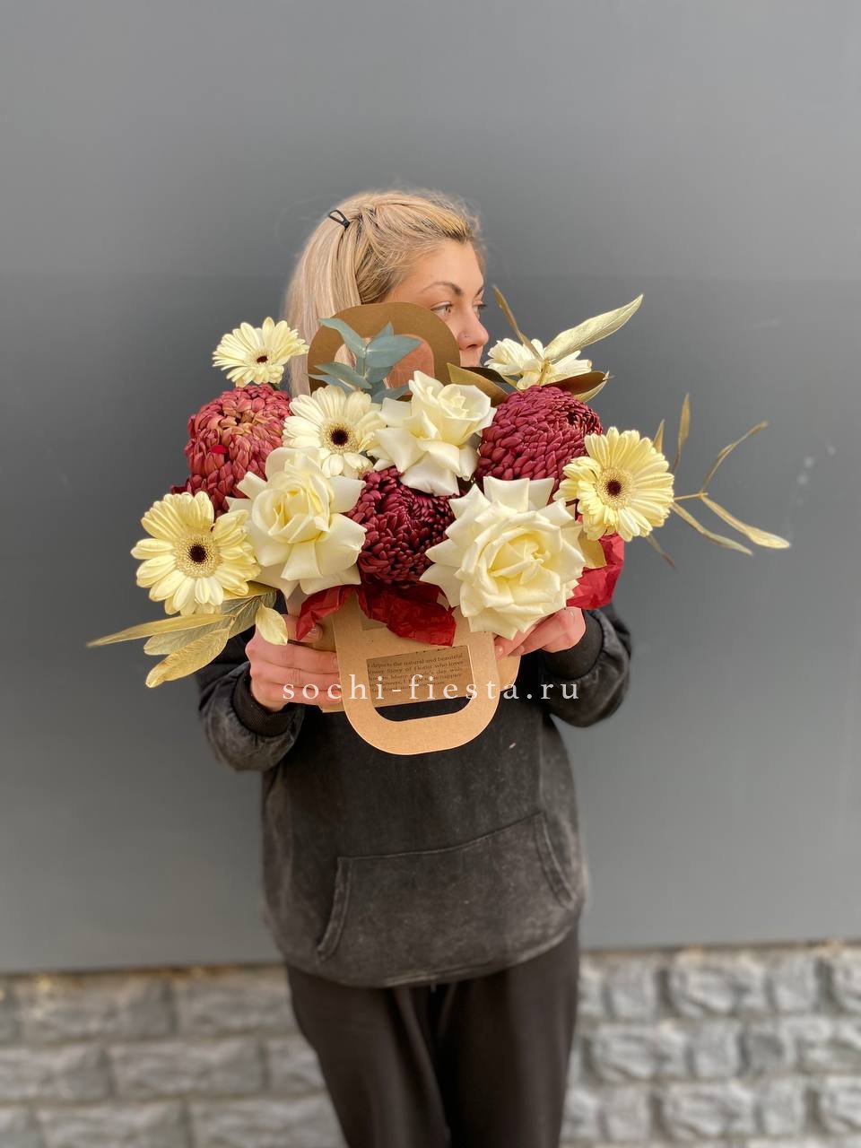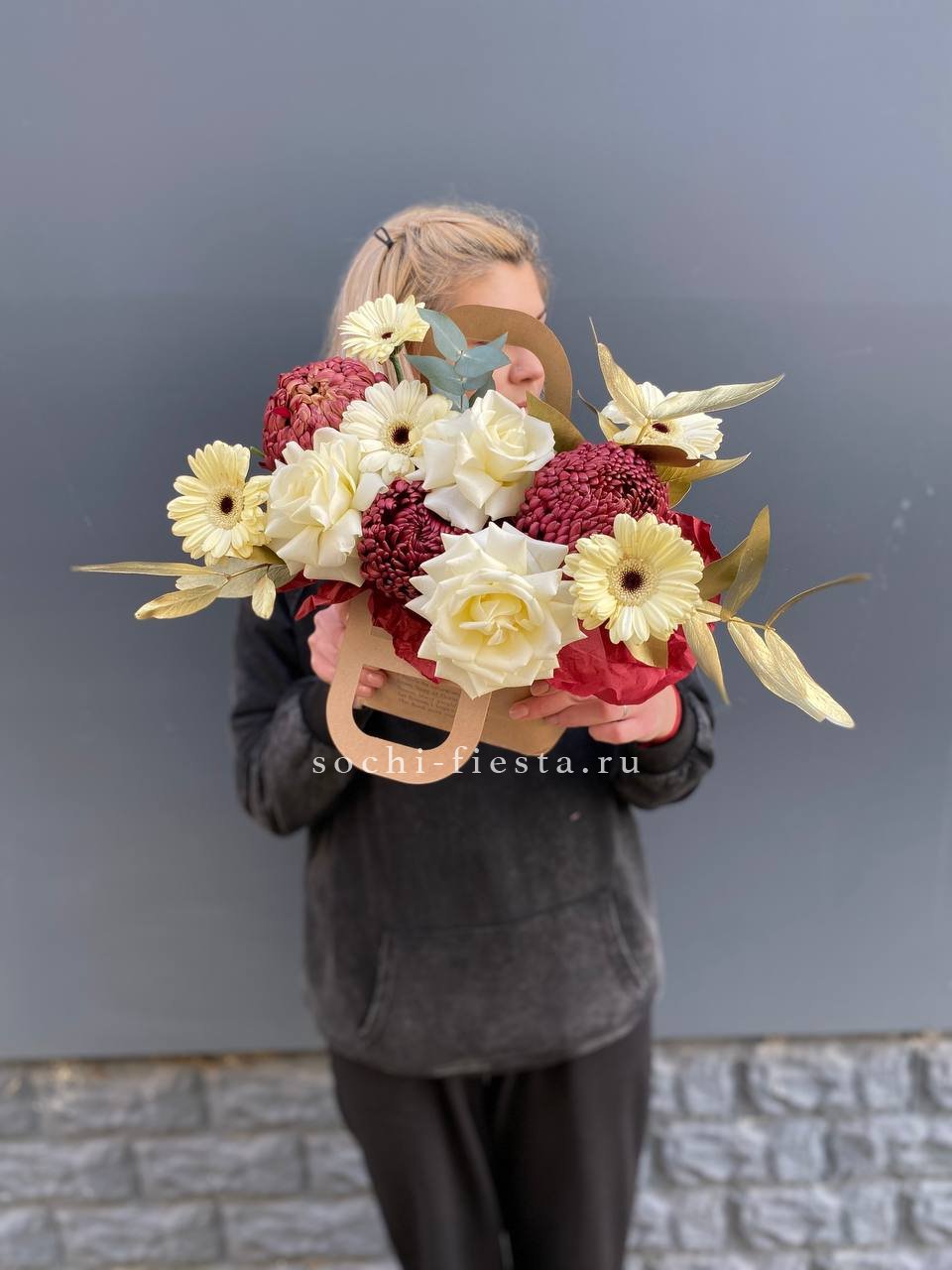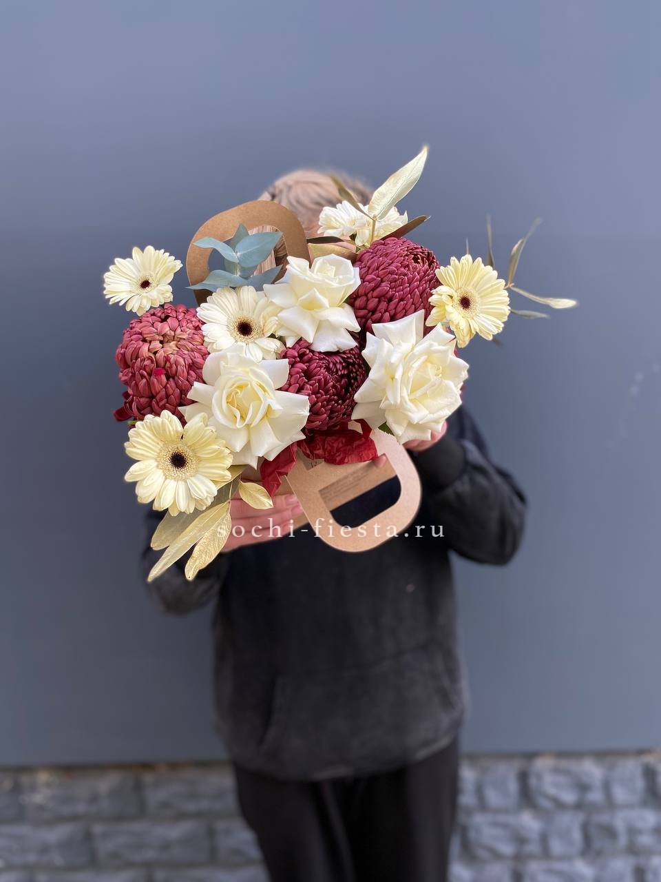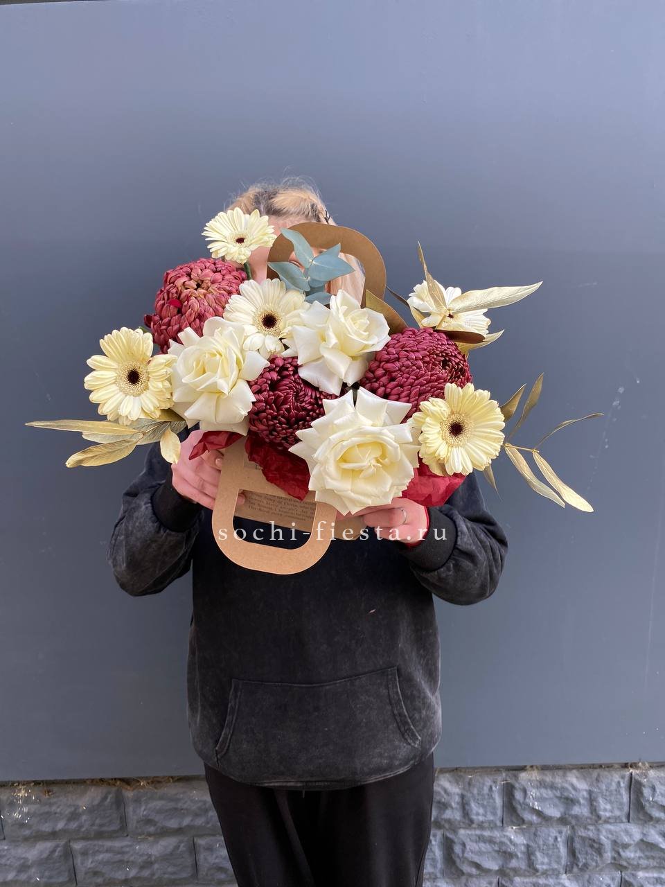 Состав: бигуди, белая роза, гербера, эвкалипт, сумочка