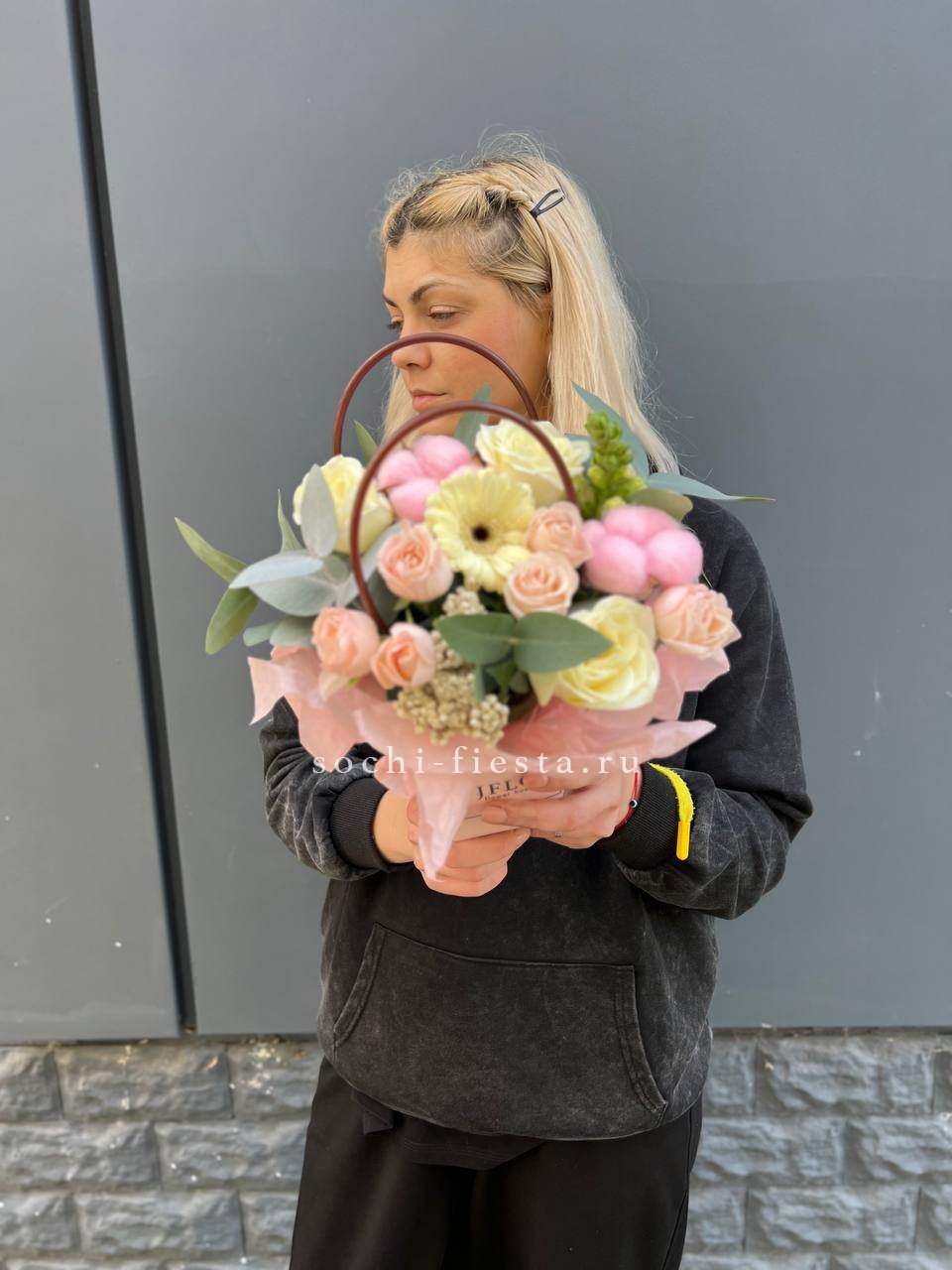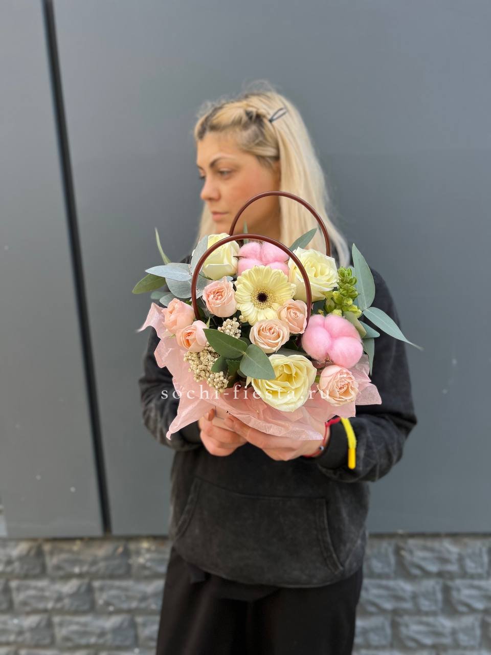 Состав: эустома, гербера, бомбастик, хлопок, эвкалипт, озатамус, розы, сумочка