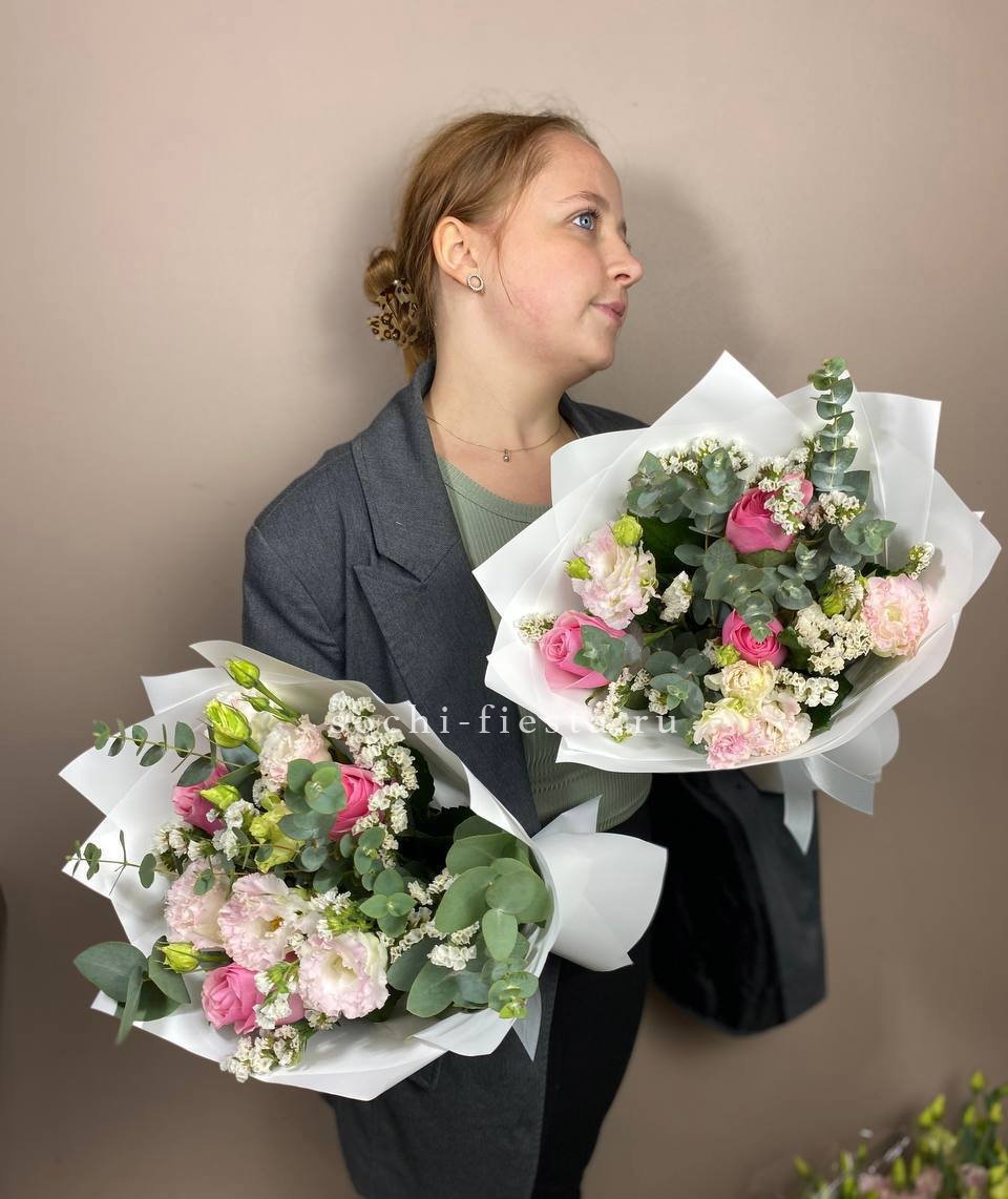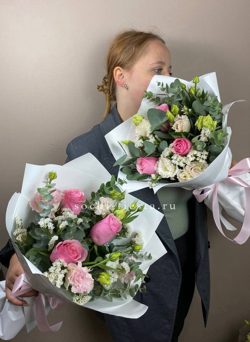 Состав: статица, роза, эустома, эвкалипт, пленка, лента