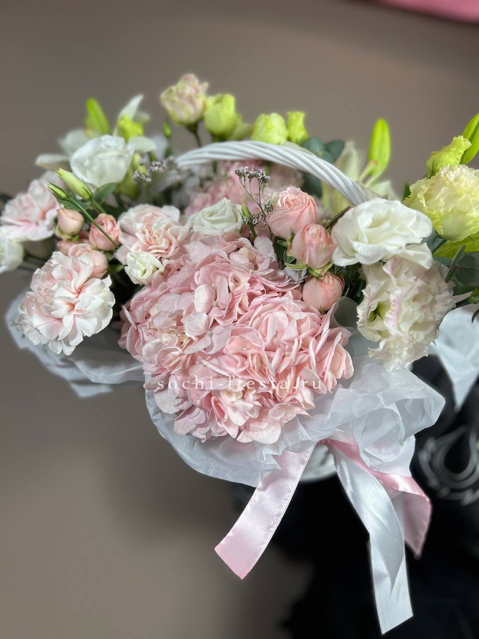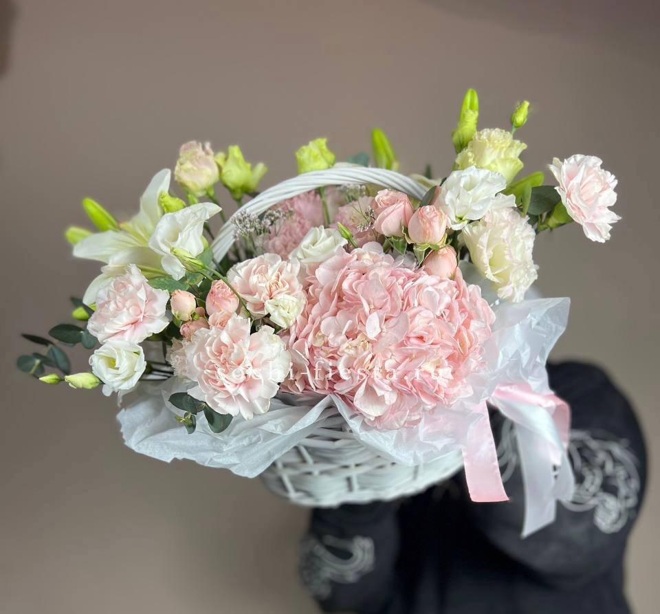 Состав: гортензия. бомбастик, диантус, лимониум, лилия, эустома. эвкалипт, корзина малая