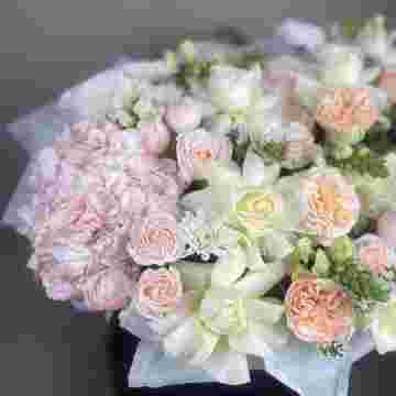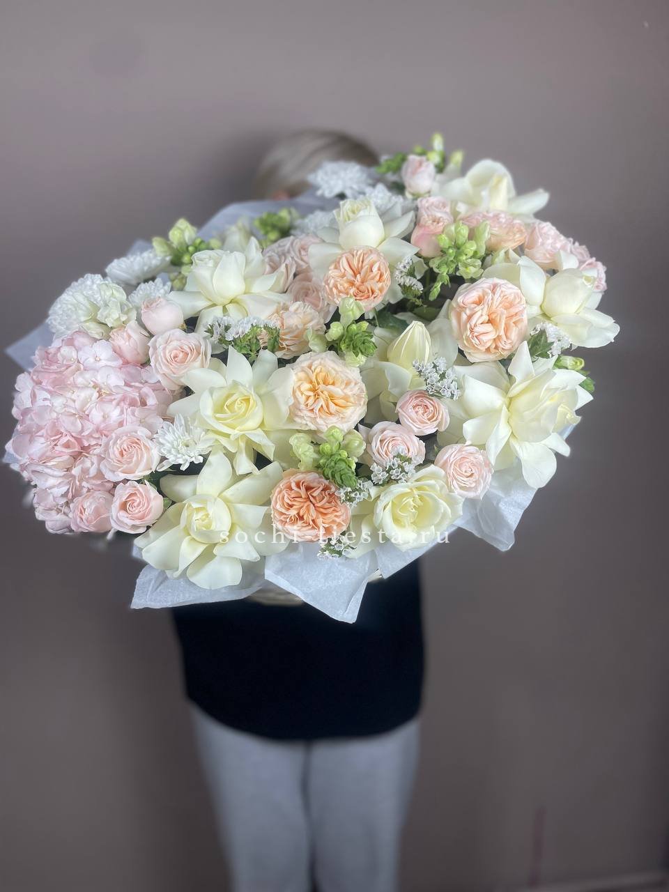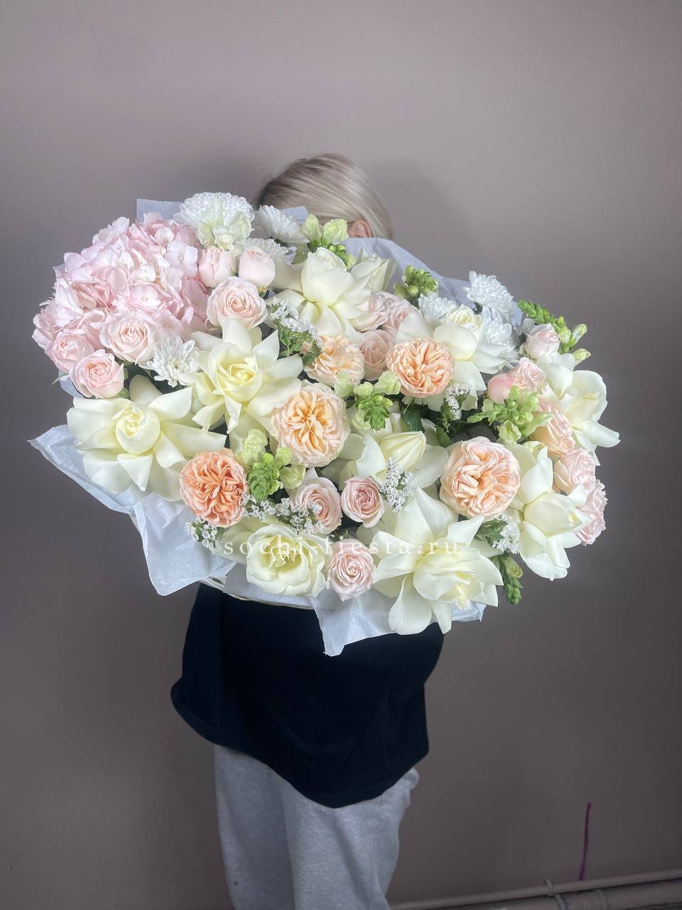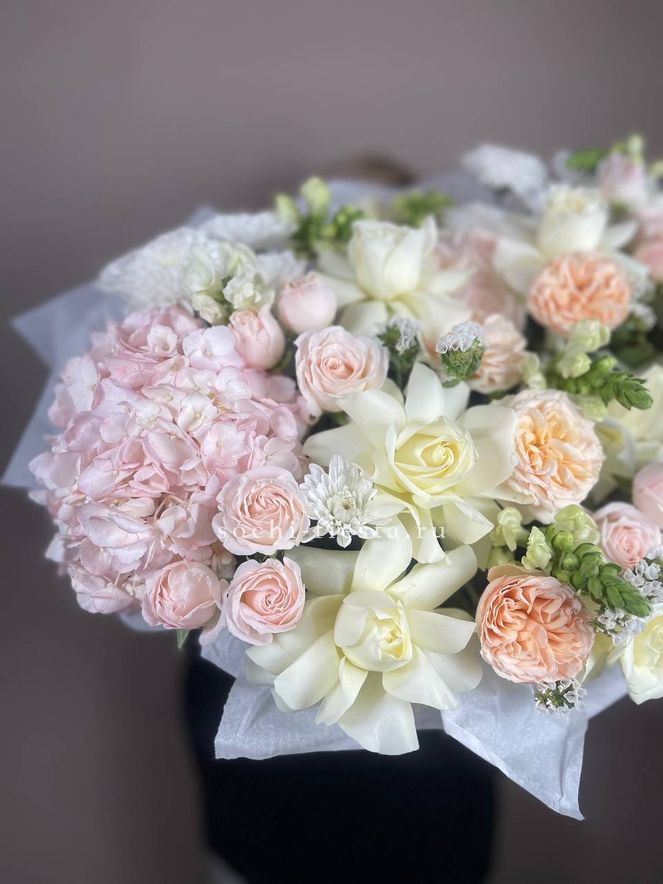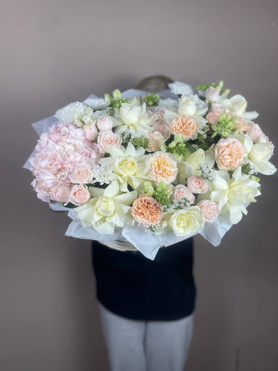 Состав: хризантема, кустовая роза, гортензия, белая роза, антиринум, статица, корзина средняя
