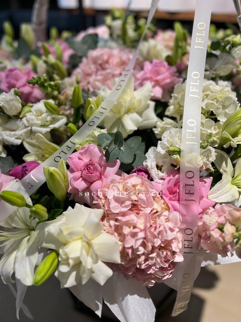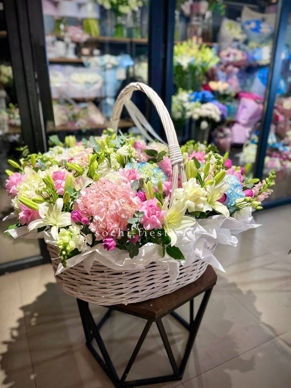 Состав: лилии, гортензия, антиринум, мисти баблс, розы, эустома, корзина гигант