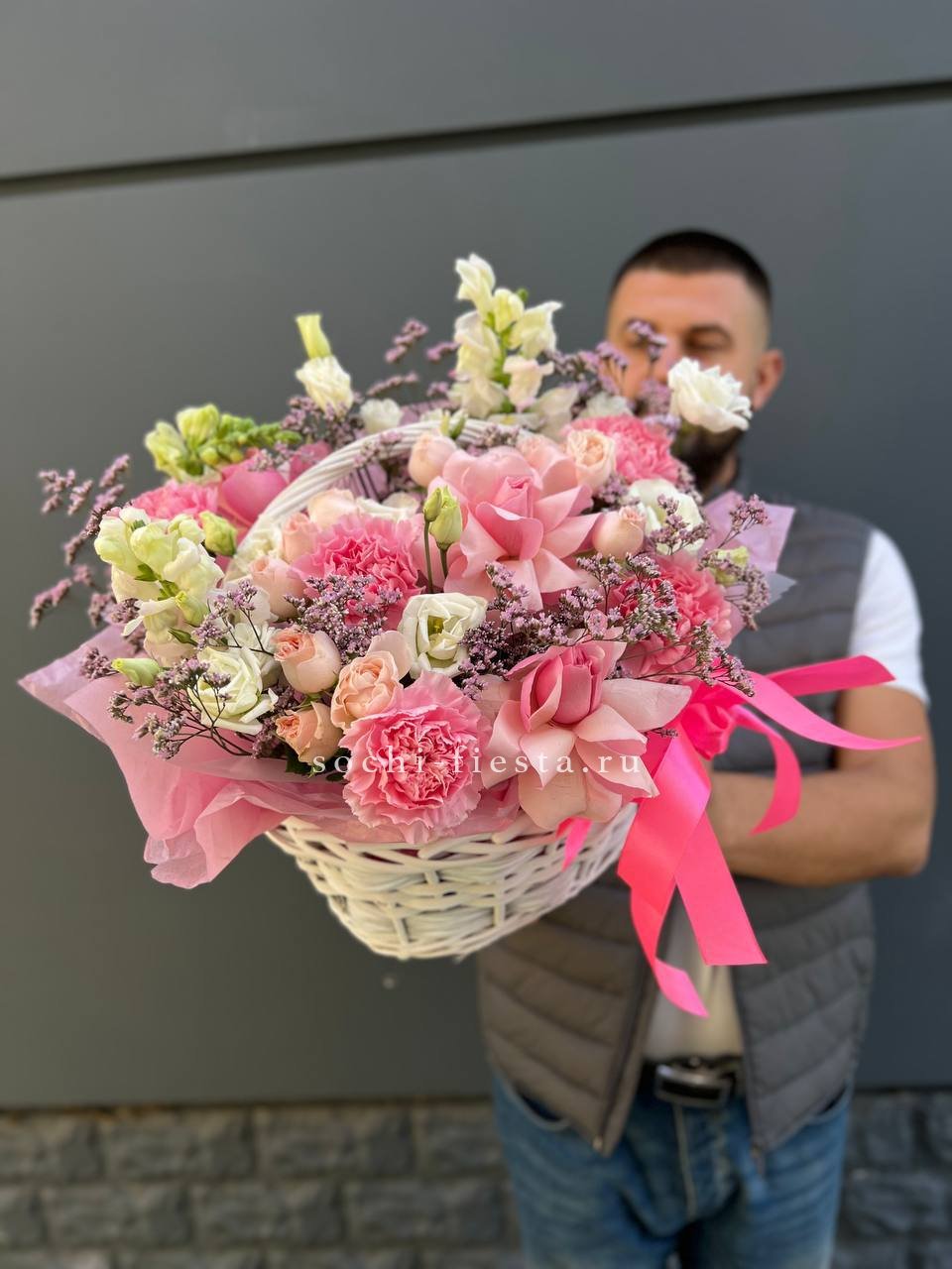 Состав: корзина из нежных цветов диантусов, роз, эустомы