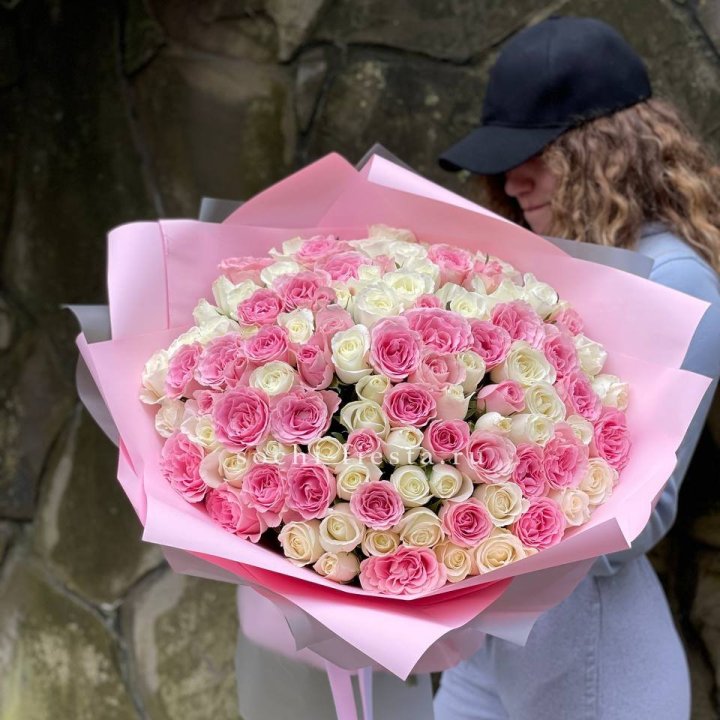 101 розовая роза в белом