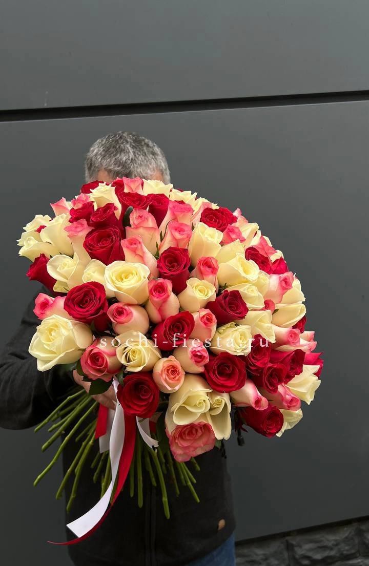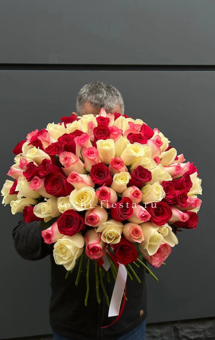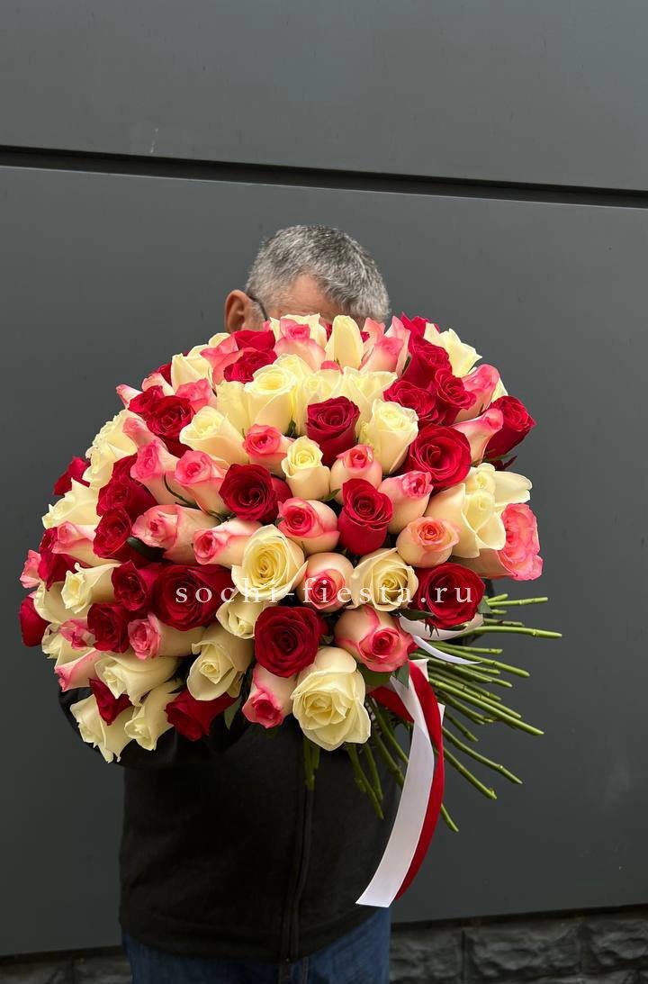 Состав: 101 роза разноцветных оттенков, лента, упаковка на выбор