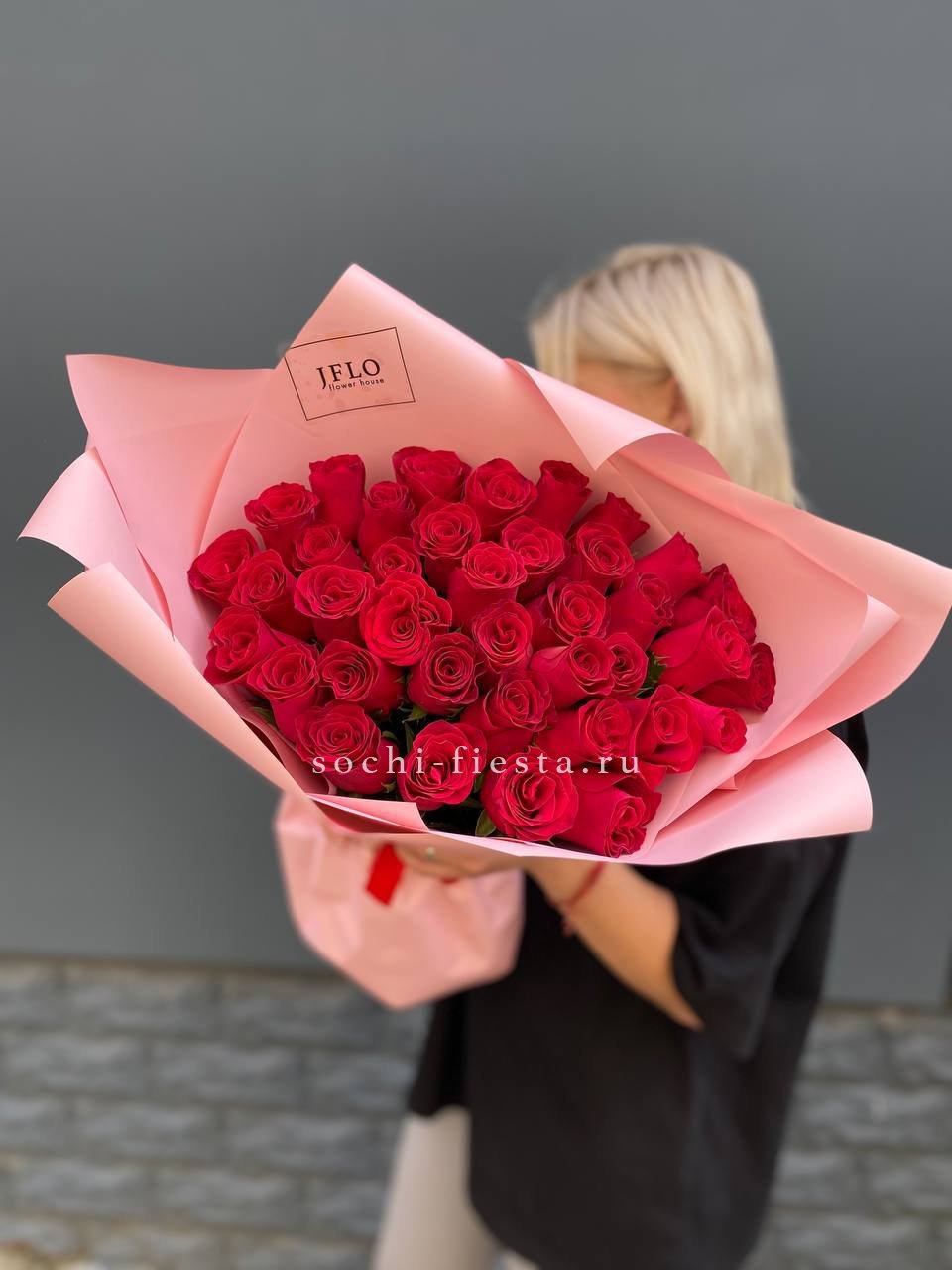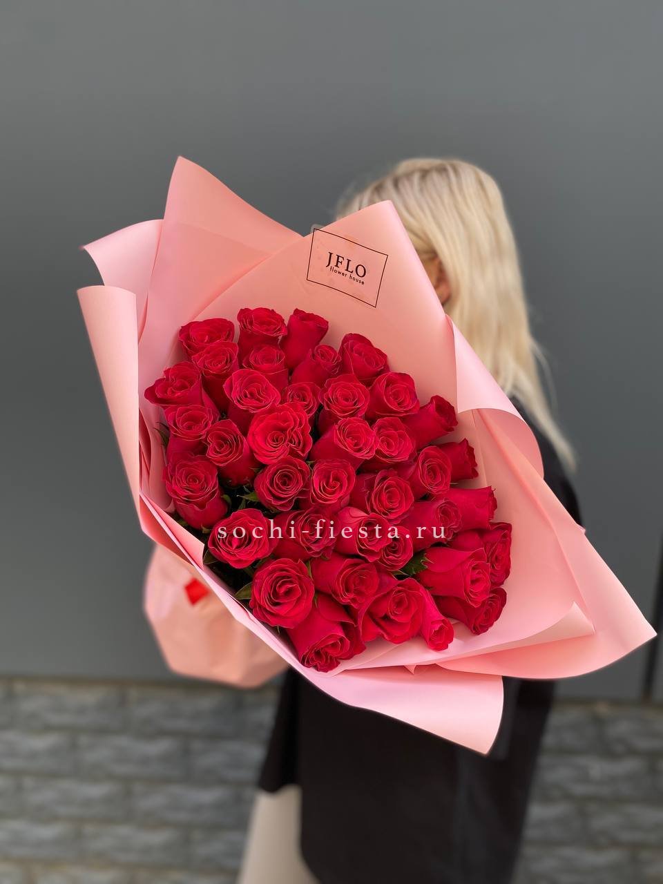 Состав: 35 красных роз, лента, дизайнерская пленка