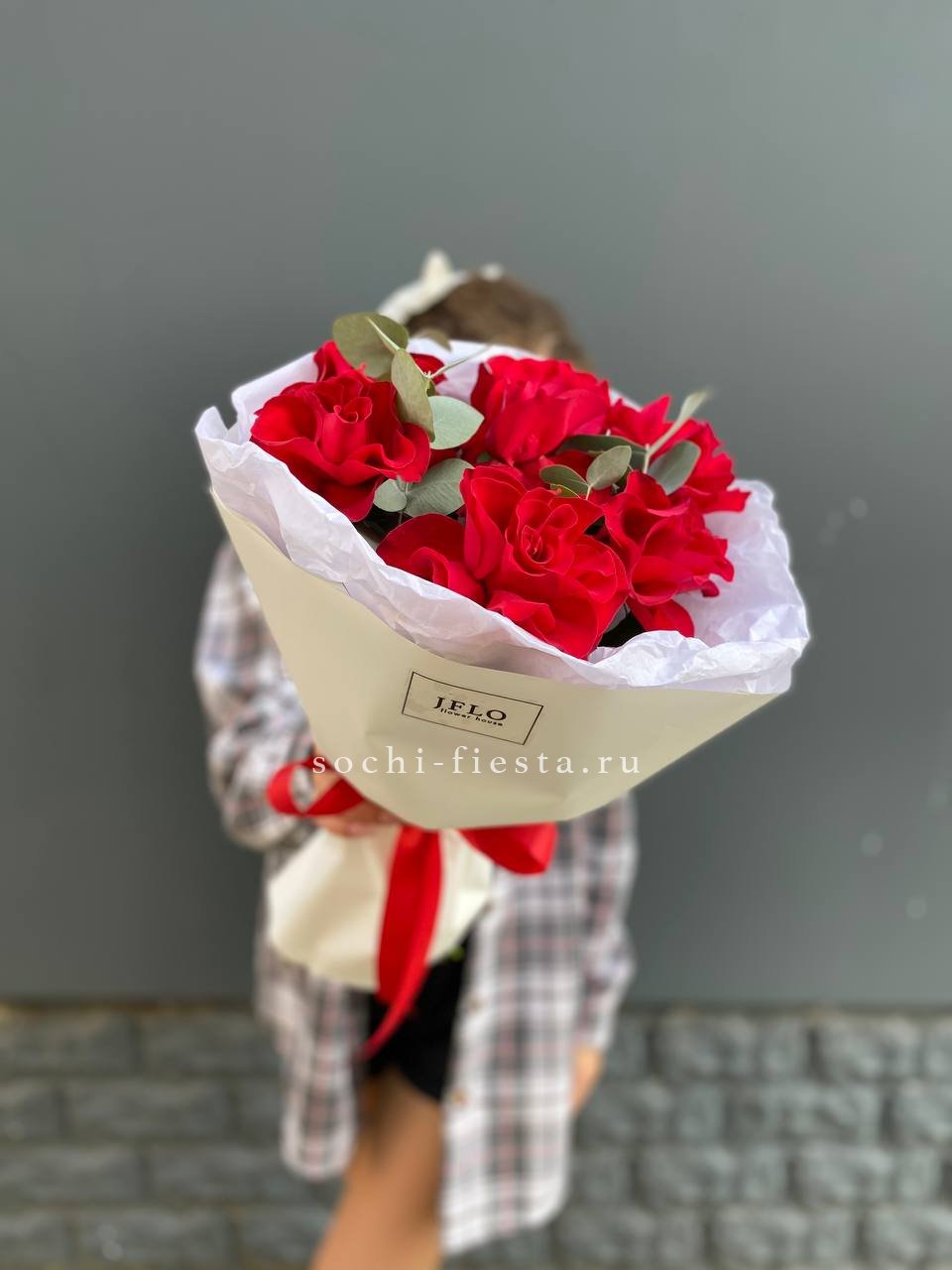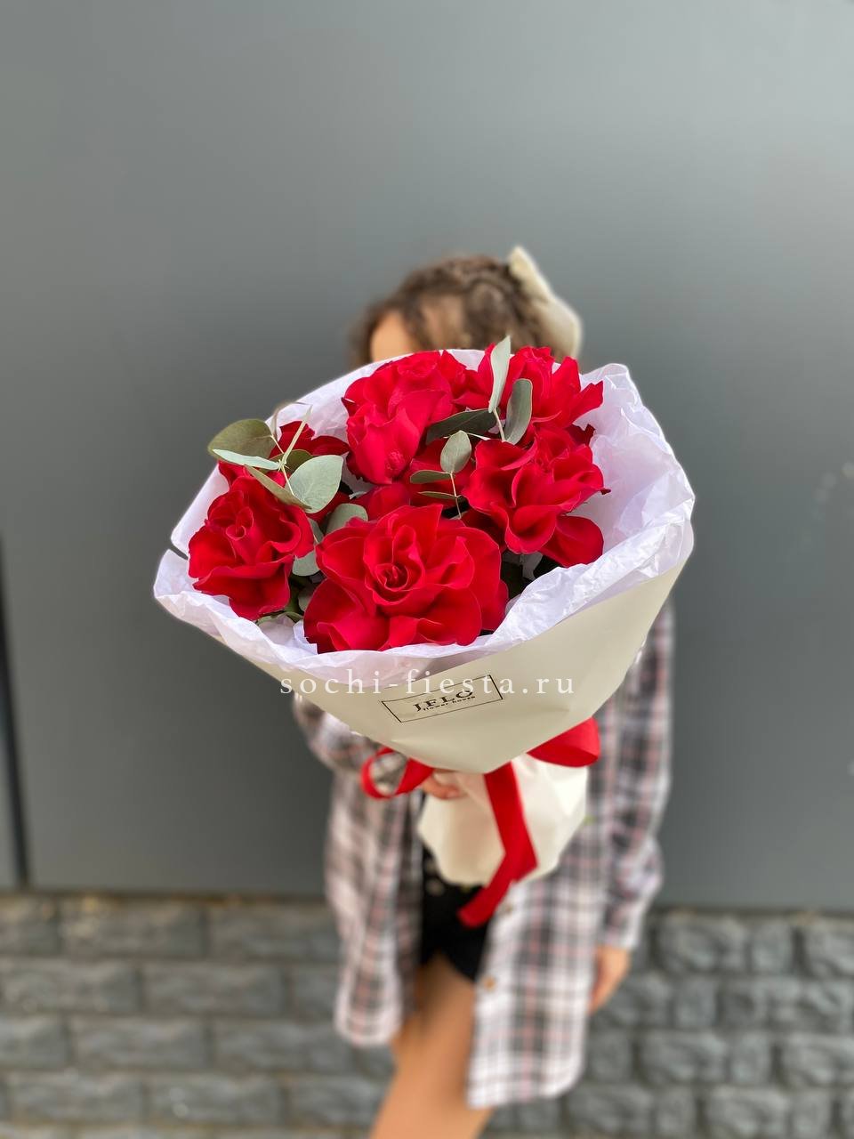 Состав: красные розы в оформлении с эвкалиптом