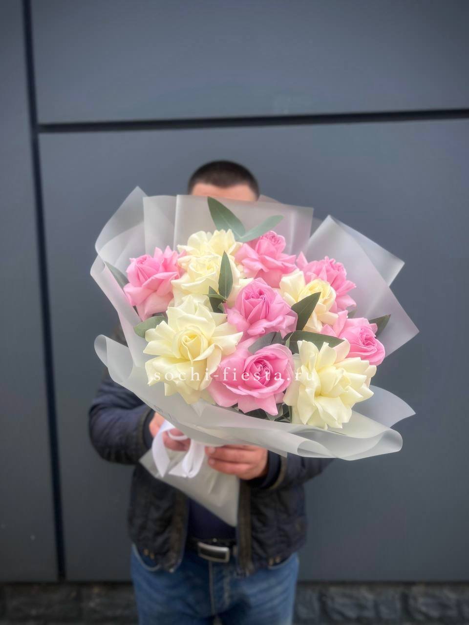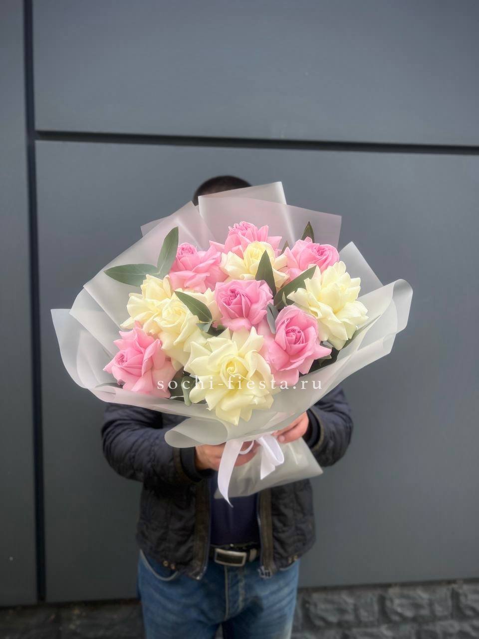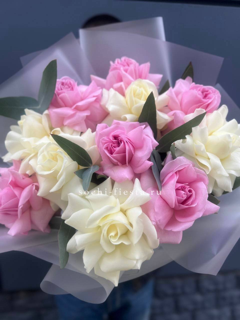 Состав: белые и розовые розы в оформлении с эвкалиптом