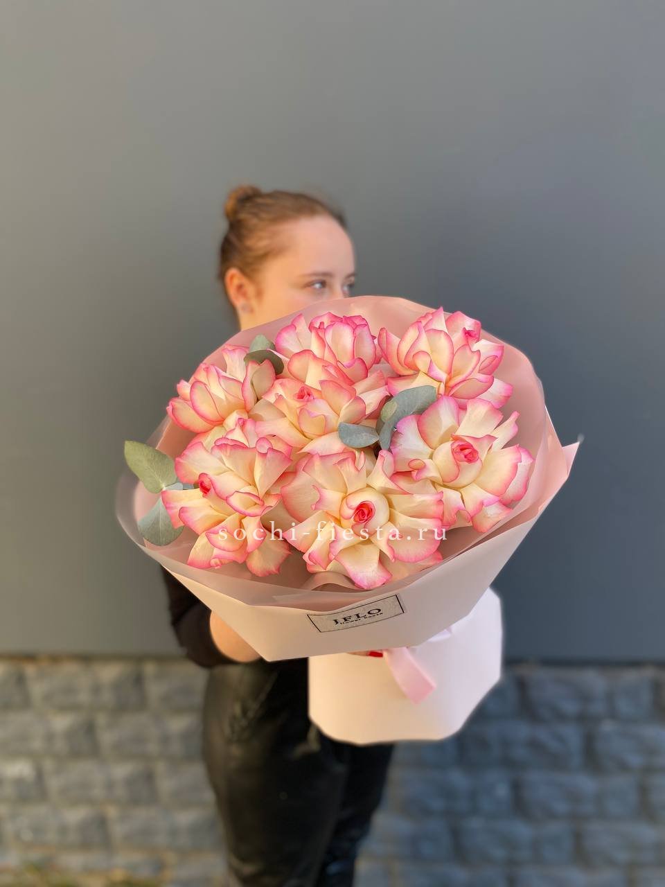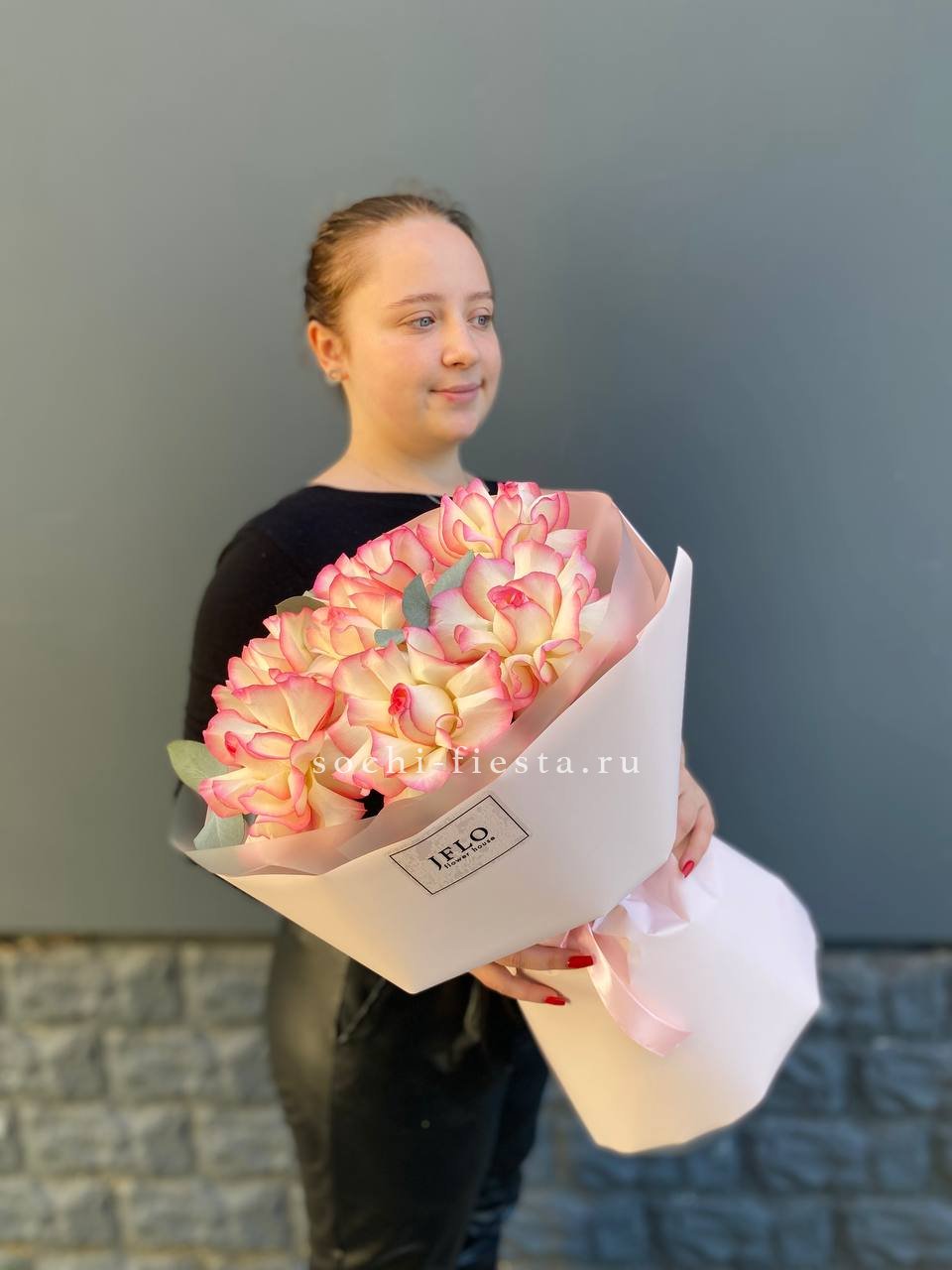 Состав: пионовидная кустовая роза Мисти Баблс - 51 шт., эвкалипт 5 шт., хаммелациум (или аналог), лента, дизайнерская упаковка